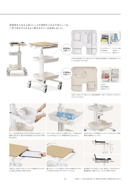 清潔物を入れる上段トレーと不潔物を入れる下段トレーは、一目で見分けられるよう異なるカラーを採用しました。□ディスポグローブ□手指消毒液□バーコードリーダー□アルコール綿□血圧計□輸液セット上段は仕切板を使うことで、取り出しやすい位置に物品を配置でき、必要な物品を1つのトレー内に収めることができます。清潔物は上段トレー不潔物は下段トレー□一般ゴミ□感染性廃棄物□注射針ボックス下段はゴミ袋ホルダーを使うことで、感染性廃棄物と一般ゴミ、注射針ボックスを分けて入れることができます。トレーのU字部分を広げながら手前に引き出すことで簡単に取り外せ、高さのある物品を入れたままでも着脱できます。グローブボックスを立てた状態でグローブを取り出すことができるよう、トレー側面形状を工夫しました。凹凸が少ないため掃除やメンテナンスもしやすく、衛生管理に最適なトレーです。天板下に、A4サイズのバインダーを収納することができ、天板上を有効に活用できます。握りやすいハンドル形状で、片手での操作がしやすいよう持ち手の中央にガイドがついています。本体両サイドにあるフックは、余長コードをまとめたり、聴診器を引っ掛けたりと、マルチに使用できます。13※価格はメーカー希望小売価格(税抜)です。消費税、組立・配送費などの諸経費を別途申し受けます。