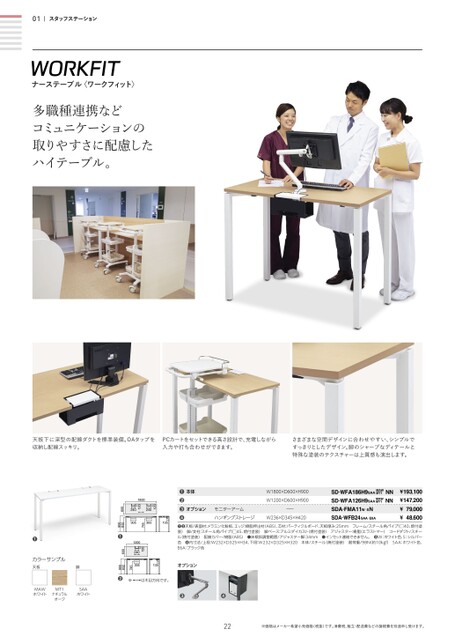 天板下に深型の配線ダクトを標準装備。OAタップを収納し配線スッキリ。PCカートをセットできる高さ設計で、充電しながら入力や打ち合わせができます。さまざまな空間デザインに合わせやすい、シンプルですっきりとしたデザイン。脚のシャープなディテールと特殊な塗装のテクスチャーは上質感も演出します。❶❷天板/表面材:メラミン化粧板、エッジ:樹脂押出材(ABS)、芯材:パーティクルボード、天板厚み:25mmフレーム/スチール角パイプ(□40、焼付塗装)脚/支柱:スチール角パイプ(□45、焼付塗装)脚ベース:アルミダイカスト(焼付塗装)アジャスター:樹脂(エラストマー)コードダクト/スチー(焼付塗装)配線カバー/樹脂(ABS)●床傾斜調整範囲/アジャスター脚:34mm●インセット連結できません。❸W:ホワイト色、S:シルバール色❹内寸法/上段:W232×D325×H34、下段:W232×D325×H320本体/スチール(焼付塗装)耐荷重/98N(約10kgf)SAA:ホワイト色、E6A:ブラック色1353057453052024011200832900●6001800202401202401600オプション135305745832900●※は木目方向です。●カラーサンプル天板脚01スタッフステーションナーステーブル〈ワークフィット〉多職種連携などコミュニケーションの取りやすさに配慮したハイテーブル。MAWホワイトMT1ナチュラルオークSAAホワイト●●22※価格はメーカー希望小売価格(税抜)です。消費税、組立・配送費などの諸経費を別途申し受けます。