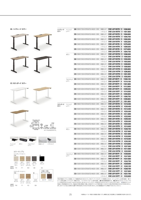 〈スタンダードカラー〉天板脚(別製)抗菌・抗ウイルス天板PAWホワイトMT1ナチュラルオークMP2ラスティックミディアムSAWホワイトXA1XA5PWT1P2SW品番内色記号天板/表面材:メラミン化粧板、エッジ:樹脂押出材(ABS・PVC)、芯材:パーティクルボード、天板厚み:25mmビーム/スチール(焼付塗装)脚/スチール(焼付塗装)、アジャスター:樹脂(ABS)コードダクト/スチール(焼付塗装)●床傾斜調整範囲8mm●品番内の¡には、ハイグレードカ抗菌・抗ウイルスラーの色記号(6AY0・6AP1・6AW3・6AG8)、またはスタンダードカラーの色記号(SWPW・SWT1・SWP2)が入ります。性能は、天板表面材のみです。本製品の天板は表面に付着した特定のウイルスの数を減少させますが、感染予防を保証するものではありません。また、抗ウイルス加工は病気の治療や予防を目的とするものではありません。SIAA登録製品です。詳細はP.6をごらんください。25※価格はメーカー希望小売価格(税抜)です。消費税、組立・配送費などの諸経費を別途申し受けます。●ハイグレードカラースタンダードカラー●1585・1385・12851185・988650最小高さ設定時※は木目方向です。最大高さ設定時12906306751750・1550・14501350・1150675655720ベーシックレバーボタンフルスペックレバー舟底エッジソフトエッジカラーサンプル〈ハイグレードカラー〉天板MY0シャビーグレーY0品番内色記号P1W3G86A脚E6AブラックMP1ナチュラルオークMW3ウォームミディアムMG8スモークドグレー