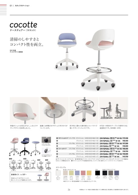 ❶サポートシェルタイプステップ付きホワイトシェルW490×D430×H660〜850CR-FGP542E1VZMD¿VZL1¿VZ62VZ92¿VZ17-W¿VN¥73,100❷ブラックシェルW490×D430×H660〜850CR-FGP542E6VZE6¿VZEAVZ64-W¿VN¥66,400❸ステップなしホワイトシェルW490×D430×H660〜850CR-FG542E1VZMD¿VZL1¿VZ62VZ92¿VZ17-W¿VN¥57,200❹ブラックシェルW490×D430×H660〜850CR-FG542E6VZE6¿VZEAVZ64-W¿VN¥50,400❺スツールタイプステップ付きホワイトシェルW490×D420×H480〜670CR-FGP540E1VZMD¿VZL1¿VZ62VZ92¿VZ17-W¿VN¥66,400❻ブラックシェルW490×D420×H480〜670CR-FGP540E6VZE6¿VZEAVZ64-W¿VN¥59,700❼ステップなしホワイトシェルW490×D420×H480〜670CR-FG540E1VZMD¿VZL1¿VZ62VZ92¿VZ17-W¿VN¥50,400❽ブラックシェルW490×D420×H480〜670CR-FG540E6VZE6¿VZEAVZ64-W¿VN¥43,70001スタッフステーションナースチェアー〈ココット〉清掃のしやすさとコンパクト性を両立。2017年度グッドデザイン賞受賞背面のシェルは凹凸がなく、ふきとりやすいデザインを採用しました。座裏には移動させやすいよう手がかりがついています。防汚性に優れた脚羽根とコンパクトで使いやすいフットレストです。H720〜H900のテーブルで使用できる座面高さです。SH480〜670)●●φ420●●φ420座/PP、クッション:モールドウレタン脚/脚羽根:強化ナイロン、ステップ:スチール丸パイプ(クロームメッキ仕上げ)、キャスター:-W)車輪径φ60mm、-V)車輪径φ50mm●ホワイトシェルタイプの回転脚は防汚性、メンテナンス性に優れたクリーンテクトコーティング仕様です。本体背・座(エコPVCレザー)※カラーサンプル本体背・座(エコPVCレザー)※φ380490490CR-FGP540FG40480〜670260480〜670420430480〜670490●●660〜850CR-FGP542CR-FG542420430480〜670φ380490(-W)A-CS18F6ナイロンキャスター●●(-V)A-CS25GE4・BKゴム単輪キャスター●●●260660〜850患者用イスP.107〜患者さんがつまずきにくいよう、薄くスッキリした円盤脚もあります。E1ホワイトグレーVZMDホワイトベージュ※耐アルコール・耐次亜塩素酸ナトリウム性能を持ったレザーです。VZL1ペールライムVZ92ライトローズVZ62ライトマリンVZ17レモンイエローE6ブラックVZE6ブラックVZEAニュートラルグレーVZ64ミディアムマリン26※価格はメーカー希望小売価格(税抜)です。消費税、組立・配送費などの諸経費を別途申し受けます。