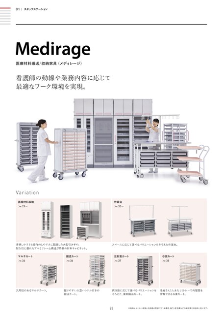 01スタッフステーション医療材料搬送/収納家具〈メディレージ〉看護師の動線や業務内容に応じて最適なワーク環境を実現。Variation医療材料収納P.29〜作業台P.33〜清掃しやすさと操作のしやすさに配慮した大型引き手や、耐久性に優れたアルミフレーム構造が特長の材料キャビネット。スペースに応じて選べるバリエーションをそろえた作業台。マルチカートP.36搬送カートP.36注射薬カートP.37与薬カートP.38汎用性のあるマルチカート。握りやすい大型ハンドル付きの搬送カート。病床数に応じて選べるバリエーションをそろえた、薬剤搬送カート。患者さん1人あたり1トレーで内服薬を管理できる与薬カート。28※価格はメーカー希望小売価格(税抜)です。消費税、組立・配送費などの諸経費を別途申し受けます。