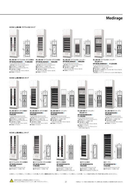 57257257257257257257257257257257266866862062062057266857257262057266866862057262057266862066806686206686206686686206686206206686206686206686686208862062062066866866820620620668668668620620620H2350上置き棚・ラテラル付き)タイプ1350135050235013502350135023501350235013502350135013502350235013502350135023501672210016721350210023501350235013502350135016722350210013502350167221001672135021002350428428428428428428428428428428428428428428428428428428428428428135023504281672210016722100428428G6424HP-MCBLWG6421HP-MCBLSG6421HP-MCBLWG6424❶上置き棚・ラテラル付きガラス両開きHP-MCBLWG6424Ω¥1,062,000外寸法/W668×D620×H2350上置き棚内寸法/W615×D420×H515●使用可能なレール段数/20段●扉内はHP-MCBLSH6424と同じです。●上置き棚内に可動棚(W615×D382厚さ19mm)1枚付き●可動棚ピッチ30mmHP-MCBLSH6424HP-MCBLSG6421HP-MCBLS421H-MCBLSG6424HM4PCBLWG61❷上置き棚・ラテラル付きガラス片開きHP-MCBLSG6424Ω¥925,000G6424外寸法/W668×D620×H2350上置き棚内寸法/W615×D420×H515●使用可能なレール段数/20段●扉内はHP-MCBLSH6424と同じです。●上置き棚内に可動棚(W615×D382厚さ19mm)1枚付き●可動棚ピッチ30mm❸上置き棚・ラテラル付きシャッターHP-MCBLSH6424Ω¥960,000外寸法/W668×D620×H2350上置き棚内寸法/W615×D420×H515●使用可能なレール段数/19段●上置き棚内に可動棚(W615×D382厚さ19mm)1枚付き●可動棚ピッチ30mm❹上置き棚・ラテラル付きシャッター(薬品庫付き)HP-MCBLSHM6424Ω¥1,224,000外寸法/W668×D620×H2350上置き棚内寸法/W615×D420×H515●使用可能なレール段数/11段●上置き棚内に可動棚(W615×D382厚さ19mm)1枚付き●可動棚ピッチ30mm※薬品庫はシャッタータイプのキャビネット以外にも取付可能です。P-MCBLSHM6424HP-MCBLWG6424HMCBLG21-BLG6421HP-MCBLSHM6424RP-CLWG6424P-MCB6424MBSH6424HP-MCBLSHM6424MCBLSH6424HSH6424HP-MCBLSHM6424H-MLM6424M644RHP-MCBWG6424NHP-MCBSG6424NHP-MCBSH6424NHP-MCBSHM6424NHP-MCBK6424N6686206686206686206686206686205721778235057217782350572177823505721778235057217782350H2350上置き棚付き)タイプ❺上置き棚付きガラス両開きHP-MCBWG6424NΩ¥926,000外寸法/W668×D620×H2350上置き棚内寸法/W615×D420×H515●使用可能なレール段数/24段●扉内はHP-MCBK6424Nと同じです。●上置き棚内に可動棚●可動棚ピッチ30mm(W615×D382厚さ19mm)1枚付き❻上置き棚付きガラス片開きHP-MCBSG6424NΩ¥804,000外寸法/W668×D620×H2350上置き棚内寸法/W615×D420×H515●使用可能なレール段数/25段●扉内はHP-MCBK6424Nと同じです。●上置き棚内に可動棚●可動棚ピッチ30mm(W615×D382厚さ19mm)1枚付き❼上置き棚付きシャッターHP-MCBSH6424NΩ¥835,000外寸法/W668×D620×H2350上置き棚内寸法/W615×D420×H515●使用可能なレール段数/24段●上置き棚内に可動棚(W615×D382厚さ19mm)1枚付き●可動棚ピッチ30mm❽上置き棚付きシャッター(薬品庫付き)HP-MCBSHM6424NΩ¥1,100,000外寸法/W668×D620×H2350上置き棚内寸法/W615×D420×H515●使用可能なレール段数/16段●上置き棚内に可動棚(W615×D382厚さ19mm)1枚付き●可動棚ピッチ30mm※薬品庫はシャッタータイプのキャビネット以外にも取付可能です。❾上置き棚付きオープンHP-MCBK6424NΩ¥605,000外寸法/W668×D620×H2350上置き棚内寸法/W615×D420×H515●使用可能なレール段数/25段●上置き棚内に可動棚●可動棚ピッチ30mm(W615×D382厚さ19mm)1枚付き57213502350428HP-MCBK6421NHP-MCBLSH642466866862055036857213500023504286686206206206686685725726686206206686205726206685725721350235013502100235016722100135023502100135023501350235016722100428428428428428428428428HP-MCBLWG6421HP-MCBLWG6424HP-MCBLSG6421HP-MCBLSH6424HMCBLSG6424HP-MCBWG6421NHP-MCBLSHM6424HP-MCBSG6421NHP-MCBLSHM6424RHP-CLWG6424HP-MCBLSG6424ラテラル付きガラス両開きHP-MCBLWG6421¥961,000外寸法/W668×D620×H2100●使用可能なレール段数/19段ラテラル付きガラス片開きHP-MCBLSG6421¥780,000外寸法/W668×D620×H2100●使用可能なレール段数/19段ガラス両開きHP-MCBWG6421N¥814,000外寸法/W668×D620×H2100●使用可能なレール段数/23段●扉内はHP-MCBK6421Nと同じですHP-MCBLWG6421ガラス片開きHP-MCBSG6421N¥654,000外寸法/W668×D620×H2100●使用可能なレール段数/24段●扉内はHP-MCBK6421Nと同じですオープンHP-MCBK6421NΩ¥452,000外寸法/W668×D550×H2100●使用可能なレール段数/24段※浅型トレー×2、中深型トレー×4、深型トレー×2が付属しています。❹❽薬品庫付きは、浅型トレー×3、中深型トレー×2、深型トレー×2が付属)トレーの増減や変更などをご希望の場合はお問い合わせください。!医療材料収納は、必ず転倒防止対策を行ってください。詳しくは2025年総合カタログファニチャー編P.744をごらんください。31※価格はメーカー希望小売価格(税抜)です。消費税、組立・配送費などの諸経費を別途申し受けます。H2100上置き棚なし)タイプ668620668620668668620668620668620572135023501672210042857213502350428