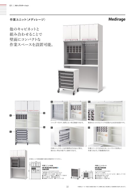 01スタッフステーション作業ユニット〈メディレージ〉他のキャビネットと組み合わせることで壁面にコンパクトな作業スペースを設置可能。ABACBDシャッター付きで、使用しない時は施錠できます。輸液を引っかけるとフックの回転が止まる安全設計です。CD作業ユニットカートは作業時は引き出して使え、使わない時は天板下に収納できます。作業スペースでがあるため、コンパクトで効率よく作業できます。可動棚3枚付き)※作業ユニットを単体設置する場合は床固定を行ってください。134062032※価格はメーカー希望小売価格(税抜)です。消費税、組立・配送費などの諸経費を別途申し受けます。外寸法/W650×D460×H855天板/メラミン化粧板キャスター/エラストマーキャスターφ1002輪ストッパー付き●天板耐荷重/98N(10kgf)●64中深型トレー5個付き●使用可能なレール段数/5段HP-MCTW6408HP-M6408作業ユニットカートHP-MCTW6408¥376,000670670650650460460480480855855外寸法/W1340×D620×H2350上置き棚内寸法/W615×D420×H515本体・棚板/メラミン化粧板取手/ABS●上置きユニット2個付き●薬剤トレー15個付き●フック5個付き●可動棚3枚付き●可動棚ピッチ60mm●アジャスター付き880510320作業ユニット本体HP-MCBCWS1324N3Ω¥984,000180HP-MCBCW1324N5886482350572