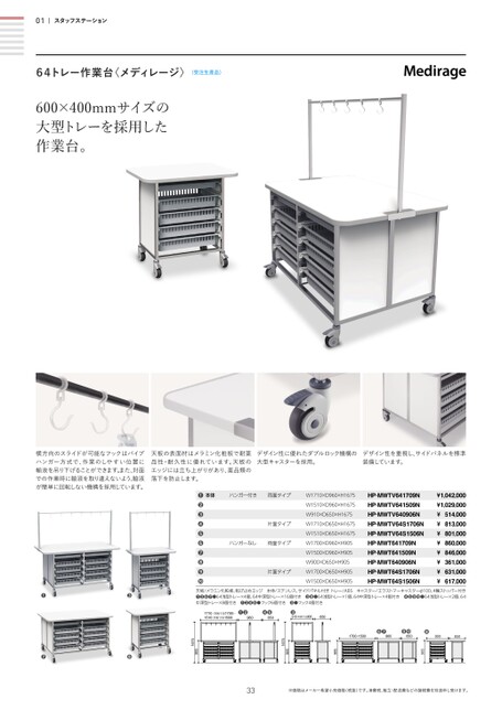横方向のスライドが可能なフックはパイプハンガー方式で、作業のしやすい位置に輸液を吊り下げることができます。また、対面での作業時に輸液を取り違えないよう、輸液が簡単に回転しない機構を採用しています。天板の表面材はメラミン化粧板で耐薬品性・耐久性に優れています。天板のエッジには立ち上がりがあり、薬品類の落下を防止します。デザイン性に優れたダブルロック機構の大型キャスターを採用。デザイン性を重視し、サイドパネルを標準装備しています。33※価格はメーカー希望小売価格(税抜)です。消費税、組立・配送費などの諸経費を別途申し受けます。HP-MWTV64S1506NHP-MWTV640906NHP-MWT64S1506NHP-MWT640906N天板/メラミン化粧板、転び止めエッジ本体/ステンレス、サイドパネル付きトレー/ABSキャスター/エラストマーキャスターφ100、4輪ストッパー付き❶❷❻❼●64浅型トレー×4個、64中深型トレー×16個付き❸❽●64浅型トレー×1個、64中深型トレー×4個付き❹❺❾●64浅型トレー×2個、64中深型トレー×8個付き❶❷❹❺●フック6個付き❸●フック4個付き1710(天板寸法1700)・1510天板寸法1500)●●960●●650●910天板寸法900)6501700・1500●●960●●650●90065090590590516759051675●●●●01スタッフステーション64トレー作業台〈メディレージ〉〈受注生産品〉600×400mmサイズの大型トレーを採用した作業台。