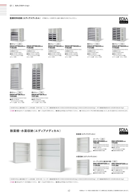 01スタッフステーション医療材料収納〈エディアメディカル〉※写真のトレーは別売です。品番・価格はP.49をごらんください。上置き❶大トレーBWUH-HPTBKU49SAW¥136,300外寸法/W900×D450×H915右側棚部内寸法/W207×D448×H865●棚板/大1枚、小2枚付き(ピッチ23.4mmで可動)※トレー別売BWUH-HPTBKU59SAW¥139,500外寸法/W900×D450×H1050右側棚部内寸法/W207×D448×H1000●棚板/大1枚、小2枚付き(ピッチ23.4mmで可動)※トレー別売上置き❷小トレーBWUH-HPTSKU49SAW¥183,500外寸法/W900×D450×H915右側棚部内寸法/W207×D448×H865●棚板/中2枚、小2枚付き(ピッチ23.4mmで可動)※トレー別売BWUH-HPTSKU59SAW¥193,300外寸法/W900×D450×H1050右側棚部内寸法/W207×D448×H1000●棚板/中2枚、小2枚付き(ピッチ23.4mmで可動)※トレー別売下置き❸大トレーBWUH-HPTBKD49SAW¥131,800外寸法/W900×D450×H915右側棚部内寸法/W207×D448×H865●棚板/小2枚付き(ピッチ23.4mmで可動)※ベース必要※トレー別売下置き❹小トレーBWUH-HPTSKD49SAW¥176,600外寸法/W900×D450×H915右側棚部内寸法/W207×D448×H865●棚板/小2枚付き(ピッチ23.4mmで可動)※ベース必要※トレー別売下置き❺大トレーBWUH-HPTBK76SAW¥245,600外寸法/W648×D450×H1830●棚板/大1枚付き(ピッチ23.4mmで可動)※ベース必要※トレー別売下置き❻小トレーBWUH-HPTSK76SAW¥337,500外寸法/W675×D450×H1830●棚板/中2枚付き(ピッチ23.4mmで可動)※ベース必要※トレー別売本体・扉・引き出し・鏡板・棚板/スチール、焼付塗装引き手/ABSトレー/PS棚板耐荷重(等分布)/W900・D450用:490N(約50kgf)、W900・D320用:343N(約35kgf)ガラス棚板耐荷重(等分布)/W900用・98N(約10kgf)〈ご注意〉●本体は必ず上下・左右を連結してください。●ベースは必ずご使用ください。●設置は必ず床面との水平を保ってください。●H1830以上のタイプをご使用の場合は壁面にセットし、壁・床に固定することをおすすめします。散薬棚・水薬収納〈エディアメディカル〉散薬棚〈エディアメディカル〉上置きオープンBWU-HPK49SSSAW¥68,300外寸法/W900×D320×H915内寸法/W862×D318×H865●棚板/3枚付き(ピッチ23.4mmで可動)●段差用天板取付可能BWU-HPK59SSSAW¥70,500外寸法/W900×D320×H1050内寸法/W862×D318×H1000●棚板/3枚付き(ピッチ23.4mmで可動)●段差用天板取付可能水薬収納〈エディアメディカル〉オープン(ガラス棚3枚付属)BWU-HPK49TGSSSAW¥139,500外寸法/W900×D320×H915内寸法/W842×D318×H865●ガラス棚板3枚付き(ピッチ23.4mmで可動)●段差用天板取付可能上置きBWU-HPK59TGSSSAW¥141,200外寸法/W900×D320×H1050内寸法/W842×D318×H1000●ガラス棚板3枚付き(ピッチ23.4mmで可動)●段差用天板取付可能本体・扉・引き出し・鏡板・棚板/スチール、焼付塗装引き手/ABSトレー/PS棚板耐荷重(等分布)/W900・D450用:490N(約50kgf)、W900・D320用:343N(約35kgf)ガラス棚板耐荷重(等分布)/W900用・98N(約10kgf)〈ご注意〉●本体は必ず上下・左右を連結してください。●ベースは必ずご使用ください。●設置は必ず床面との水平を保ってください。42※価格はメーカー希望小売価格(税抜)です。消費税、組立・配送費などの諸経費を別途申し受けます。