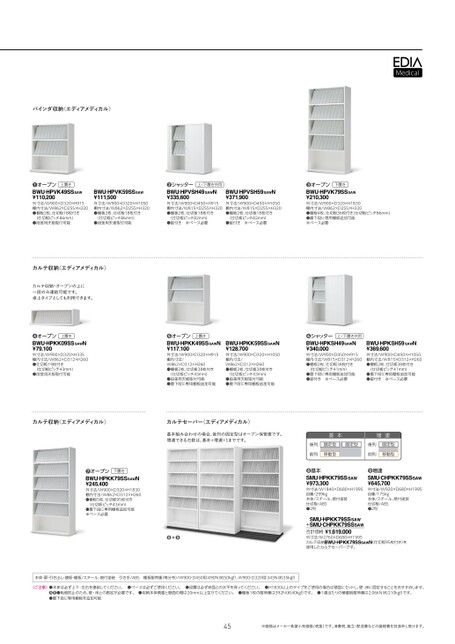 バインダ収納〈エディアメディカル〉上置き❶オープンBWU-HPVK49SSSAW¥110,200外寸法/W900×D320×H915棚内寸法/W862×D255×H320●棚板2枚、仕切板18枚付き(仕切板ピッチ86mm)●段差用天板取付可能BWU-HPVK59SSSAW¥111,500外寸法/W900×D320×H1050棚内寸法/W862×D255×H320●棚板2枚、仕切板18枚付き(仕切板ピッチ86mm)●段差用天板取付可能上/下置き共用❷シャッターBWU-HPVSH49SAWN¥335,600外寸法/W900×D450×H915棚内寸法/W815×D255×H320●棚板2枚、仕切板18枚付き(仕切板ピッチ82mm)●錠付き※ベース必要カルテ収納〈エディアメディカル〉カルテ収納・オープンの上に一段のみ連結可能です。卓上タイプとしても利用できます。上置き❹オープンBWU-HPKK09SSSAWN¥79,100外寸法/W900×D320×H335棚内寸法/W862×D312×H260●仕切板19枚付き(仕切板ピッチ43mm)●段差用天板取付可能上置き❺オープンBWU-HPKK49SSSAWN¥117,100外寸法/W900×D320×H915棚内寸法/W862×D312×H260●棚板2枚、仕切板38枚付き(仕切板ピッチ43mm)●段差用天板取付可能●最下段に専用棚板追加可能BWU-HPVSH59SAWN¥371,900外寸法/W900×D450×H1050棚内寸法/W815×D255×H320●棚板2枚、仕切板18枚付き(仕切板ピッチ82mm)●錠付き※ベース必要BWU-HPKK59SSSAWN¥128,700外寸法/W900×D320×H1050棚内寸法/W862×D312×H260●棚板2枚、仕切板38枚付き(仕切板ピッチ43mm)●段差用天板取付可能●最下段に専用棚板追加可能下置き❸オープンBWU-HPVK79SSSAW¥210,300外寸法/W900×D320×H1830棚内寸法/W862×D255×H320●棚板4枚、仕切板36枚付き(仕切板ピッチ86mm)●最下段に専用棚板追加可能※ベース必要上/下置き共用❻シャッターBWU-HPKSH49SAWN¥340,000外寸法/W900×D450×H915棚内寸法/W815×D312×H260●棚板2枚、仕切板38枚付き(仕切板ピッチ41mm)●最下段に専用棚板追加可能●錠付き※ベース必要BWU-HPKSH59SAWN¥369,600外寸法/W900×D450×H1050棚内寸法/W815×D312×H260●棚板2枚、仕切板38枚付き(仕切板ピッチ41mm)●最下段に専用棚板追加可能●錠付き※ベース必要カルテ収納〈エディアメディカル〉カルテセーバー〈エディアメディカル〉基本組み合わせの場合、後列の固定型はオープン保管庫です。増連できる台数は、基本+増連×1までです。下置き❼オープンBWU-HPKK79SSSAWN¥245,400外寸法/W900×D320×H1830棚内寸法/W862×D312×H260●棚板5枚、仕切板95枚付き(仕切板ピッチ43mm)●最下段に専用棚板追加可能※ベース必要●●+本体・扉・引き出し・鏡板・棚板/スチール、焼付塗装引き手/ABS棚板耐荷重(等分布)/W900・D450用:490N(約50kgf)、W900・D320用:343N(約35kgf)基本後列前列固定型移動型固定型増連後列前列固定型移動型❽基本SMU-HPKK79SSSAW¥973,300外寸法/W1840×D680×H1995自重/299kg本体/スチール、焼付塗装仕切板/ABS●2列❾増連SMU-CHPKK79SSSAW¥645,700外寸法/W920×D680×H1995自重/175kg本体/スチール、焼付塗装仕切板/ABS●2列SMU-HPKK79SSSAW+SMU-CHPKK79SSSAW合計価格¥1,619,000カルテ収納BWU-HPKK79SSSAWN(仕切板95枚付き)を外寸法/W2760×D680×H1995使用したカルテセーバーです。〈ご注意〉●本体は必ず上下・左右を連結してください。●ベースは必ずご使用ください。●設置は必ず床面との水平を保ってください。●H1830以上のタイプをご使用の場合は壁面にセットし、壁・床に固定することをおすすめします。❽❾●転倒防止のため、壁・床との固定が必要です。●収納本体側面と壁面の間は20mm以上空けてください。●棚板1枚の耐荷重は392N(約40kgf)です。●1連当たりの積載総耐荷重は2.06kN(約210kgf)です。●最下段に専用棚板を追加可能45※価格はメーカー希望小売価格(税抜)です。消費税、組立・配送費などの諸経費を別途申し受けます。