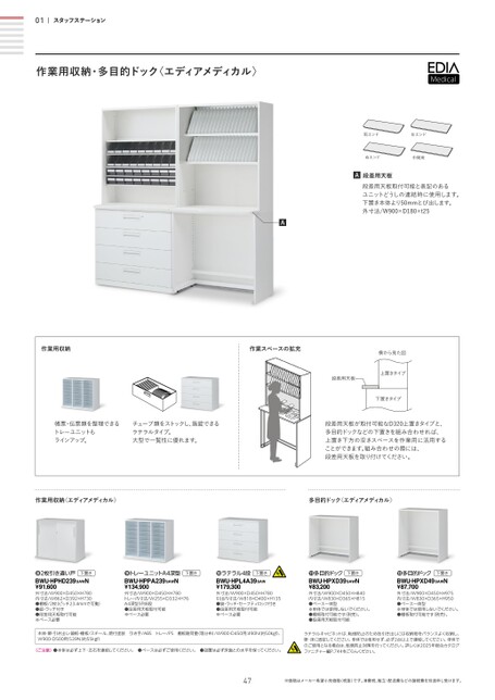 01スタッフステーション作業用収納・多目的ドック〈エディアメディカル〉両エンド左エンド右エンド中間用A段差用天板段差用天板取付可能と表記のあるユニットどうしの連結時に使用します。下置き本体より50mmとび出します。外寸法/W900×D180×t25A作業用収納作業スペースの拡充帳票・伝票類を整理できるトレーユニットもラインアップ。チューブ類をストックし、施錠できるラテラルタイプ。大型で一覧性に優れます。段差用天板横から見た図上置きタイプ下置きタイプ段差用天板が取付可能なD320上置きタイプと、多⽬的ドックなどの下置きを組み合わせれば、上置き下⽅の空きスペースを作業用に活用することができます。組み合わせの際には、段差用天板を取り付けてください。作業用収納〈エディアメディカル〉多目的ドック〈エディアメディカル〉下置き❽2枚引き違い戸BWU-HPHD239SAWN¥91,600外寸法/W900×D450×H780内寸法/W862×D392×H730●棚板/2枚(ピッチ23.4mmで可動)●錠・ラッチ付き●段差用天板取付可能※ベース必要下置き❾トレーユニットA4深型BWU-HPPA239SAWN¥134,900外寸法/W900×D450×H780トレー内寸法/W255×D332×H76A4深型3列8段●段差用天板取付可能※ベース必要下置きラテラル4段BWU-HPL4A39SAW¥179,300外寸法/W900×D450×H780引出内寸法/W818×D400×H135●錠・ラッチ・セーフティロック付き●段差用天板取付可能※ベース必要下置き多目的ドックBWU-HPXD39SAWN¥83,200外寸法/W900×D450×H840内寸法/W830×D365×H815●ベース一体型※単体では使用しないでください。●棚板取付可能です(別売)。●段差用天板取付可能下置き多目的ドックBWU-HPXD49SAWN¥87,700外寸法/W900×D450×H975内寸法/W830×D365×H950●ベース一体型※単体では使用しないでください。●棚板取付可能です(別売)。本体・扉・引き出し・鏡板・棚板/スチール、焼付塗装引き手/ABSトレー/PS棚板耐荷重(等分布)/W900・D450用:490N(約50kgf)、W900・D500用:539N(約55kgf)〈ご注意〉●本体は必ず上下・左右を連結してください。●ベースは必ずご使用ください。●設置は必ず床面との水平を保ってください。ラテラルキャビネットは、転倒防止のため各引き出しには収納物をバランスよく収納し、壁・床に固定してください。単体では使用せず、必ず2台以上で連結してください。単体でのご使用となる場合は、転倒防止対策を行ってください。詳しくは2025年総合カタログファニチャー編P.744をごらんください。47※価格はメーカー希望小売価格(税抜)です。消費税、組立・配送費などの諸経費を別途申し受けます。