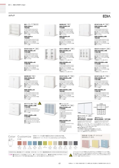 01スタッフステーションエディア上/下置き共用❶オープンBWU-K49SAW¥56,400外寸法/W900×D450×H915内寸法/W862×D448×H865●A4横(ファイルBOX)3段収納●棚板/2枚(ピッチ23.4mmで可動)※ベース必要上置き❷両開き扉BWU-SU49SAWN¥73,000外寸法/W900×D450×H915内寸法/W862×D420×H865●A4横(ファイルBOX)3段収納●棚板/2枚(ピッチ23.4mmで可動)●錠・ラッチ付き上置き❸2枚引き違い戸BWU-HU249SAWNN¥77,900外寸法/W900×D450×H915内寸法/W862×D392×H865●A4横(ファイルBOX)3段収納●棚板/2枚(ピッチ23.4mmで可動)●錠・ラッチ付きBWU-K59SAW¥59,900外寸法/W900×D450×H1050内寸法/W862×D448×H1000●A4縦(ファイル)3段収納●棚板/2枚(ピッチ23.4mmで可動)※ベース必要BWU-SU59SAWN¥77,400外寸法/W900×D450×H1050内寸法/W862×D420×H1000●A4縦(ファイル)3段収納●棚板/2枚(ピッチ23.4mmで可動)●錠・ラッチ付きBWU-HU259SAWNN¥82,400外寸法/W900×D450×H1050内寸法/W862×D392×H1000●A4縦(ファイル)3段収納●棚板/2枚(ピッチ23.4mmで可動)●錠・ラッチ付き上置き❹3枚引き違い戸BWU-HU349SAWN¥101,900外寸法/W900×D450×H915内寸法/W862×D385×H865●A4横(ファイルBOX)3段収納●棚板/2枚(ピッチ23.4mmで可動)●錠・ラッチ付き上置き❺ガラス両開き扉BWU-SGU49SAWN¥97,400外寸法/W900×D450×H915内寸法/W862×D420×H865●A4横(ファイルBOX)3段収納●棚板/2枚(ピッチ23.4mmで可動)●錠・ラッチ付き※飛散防止フィルム貼りガラス上置き❻3枚ガラス引き違い戸BWU-HGU349SAWNN¥105,700外寸法/W900×D450×H915内寸法/W862×D385×H865●A4横(ファイルBOX)3段収納●棚板/2枚(ピッチ23.4mmで可動)●錠・ラッチ付き※飛散防止フィルム貼りガラスBWU-HU359SAWN¥108,700外寸法/W900×D450×H1050内寸法/W862×D385×H1000●A4縦(ファイル)3段収納●棚板/2枚(ピッチ23.4mmで可動)●錠・ラッチ付きBWU-SGU59SAWN¥103,700外寸法/W900×D450×H1050内寸法/W862×D420×H1000●A4縦(ファイル)3段収納●棚板/2枚(ピッチ23.4mmで可動)●錠・ラッチ付き※飛散防止フィルム貼りガラスBWU-HGU359SAWNN¥112,500外寸法/W900×D450×H1050内寸法/W862×D385×H1000●A4縦(ファイル)3段収納●棚板/2枚(ピッチ23.4mmで可動)●錠・ラッチ付き※飛散防止フィルム貼りガラス下置き❼両開き扉BWU-SD49SAWN¥73,000外寸法/W900×D450×H915内寸法/W862×D420×H865●A4横(ファイルBOX)3段収納●棚板/2枚(ピッチ23.4mmで可動)●錠・ラッチ付き※ベース必要下置き❽2枚引き違い戸BWU-HD249SAWNN¥77,900外寸法/W900×D450×H915内寸法/W862×D392×H865●A4横(ファイルBOX)3段収納●棚板/2枚(ピッチ23.4mmで可動)●錠・ラッチ付き※ベース必要BWU-SD59SAWN¥77,400外寸法/W900×D450×H1050内寸法/W862×D420×H1000●A4縦(ファイル)3段収納●棚板/2枚(ピッチ23.4mmで可動)●錠・ラッチ付き※ベース必要BWU-HD259SAWNN¥82,400外寸法/W900×D450×H1050内寸法/W862×D392×H1000●A4縦(ファイル)3段収納●棚板/2枚(ピッチ23.4mmで可動)●錠・ラッチ付き※ベース必要下置きラテラル3段BWU-L3A49SAWNN¥124,500外寸法/W900×D450×H915引出内寸法/W818×D400×H264●錠・ラッチ・セーフティロック付き※ベース必要BWU-L3A59SAWNN¥132,400外寸法/W900×D450×H1050引出内寸法/W818×D400×H308●錠・ラッチ・セーフティロック付き●縦仕切板(BWUA-D1BK)/6枚付き※ベース必要下置きトレーユニットA4浅・深コンビBWU-PA349SAWN¥149,800外寸法/W900×D450×H915トレー内寸法/A4浅型:W255×D332×H34A4深型:W255×D332×H76A4浅型3列8段A4深型3列5段※ベース必要BWU-PA359SAWN¥158,500外寸法/W900×D450×H1050トレー内寸法/A4浅型:W255×D332×H34A4深型:W255×D332×H76A4浅型3列10段A4深型3列6段※ベース必要下置き❾3枚引き違い戸BWU-HD349SAWN¥101,900外寸法/W900×D450×H915内寸法/W862×D385×H865●A4横(ファイルBOX)3段収納●棚板/2枚(ピッチ23.4mmで可動)●錠・ラッチ付き※ベース必要BWU-HD359SAWN¥108,700外寸法/W900×D450×H1050内寸法/W862×D385×H1000●A4縦(ファイル)3段収納●棚板/2枚(ピッチ23.4mmで可動)●錠・ラッチ付き※ベース必要W1800H1050スライドボード上置き900・80(錠付きタイプ)BB-U259WN¥265,000BB-UL259WN¥277,200外寸法/W1800×D70×H1050板面有効寸法/W1780×H952板面/ホーロー、ホワイト色上下レール/アルミ押出材、アルマイト仕上げ●付属品/ホワイトボード用マーカー3本(赤・青・黒)、ホワイトボード用イレー外寸法/W1820×D70×H1050板面有効寸法/W1800×H910スライドボード(錠なしタイプ)ザー1個、マーカー受け(BBA-MBU2)1個●内筒交換錠(錠付きタイプのみ)※月行事表などの罫引きは別途お見積もりいたします。※スライドボード品番・価格に、収納庫は含んでいません。※オープン上置きをセットでご注文ください。Color本体・扉・鏡板・ベースCustomize扉・鏡板EDIAシリーズは扉や鏡板を12色から別色対応可能。空間のカラーコーディネートに合わせることができます。両開き扉・引き違い戸・ラテラルが別色対応しています。SAWADモデレートコーラル9Dライトローズ35ペールターコイズ6Dサックスブルー2DアッシュグリーンLFラフランス1GカスタードイエローM1ホワイトブラウンM4ミディアムグレージュM6ダークグレージュE2ライトグレーE4ミディアムグレー本体・扉・引き出し・鏡板・棚板/スチール、焼付塗装引き手/ABSトレー/PS棚板耐荷重(等分布)/W900・D450用:490N(約50kgf)〈ご注意〉●本体は必ず上下・左右を連結してく