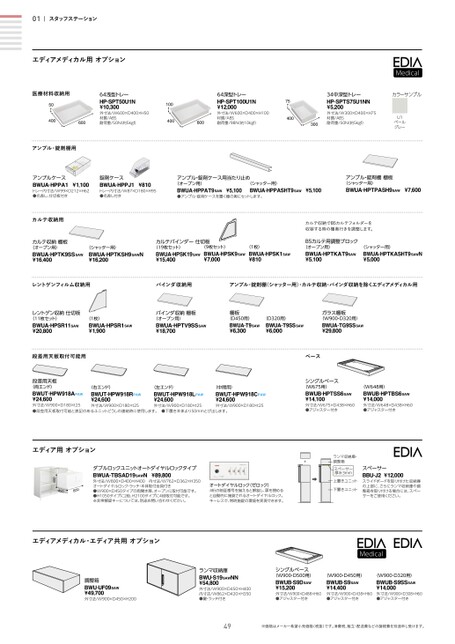 01スタッフステーションエディアメディカル用オプション医療材料収納用5040060064浅型トレーHP-SPT50U1N¥10,300外寸法/W600×D400×H50材質/ABS耐荷重/50N(約5kgf)10040060064深型トレーHP-SPT100U1N¥12,000外寸法/W600×D400×H100材質/ABS耐荷重/98N(約10kgf)7540034中深型トレーHP-SPTS75U1NN¥5,200外寸法/W300×D400×H75材質/ABS耐荷重/50N(約5kgf)300カラーサンプルU1ペールグレーアンプル・錠剤棚用アンプルケースBWUA-HPPA1¥1,100トレー内寸法/W99×D212×H62●名差し、仕切板付き錠剤ケースBWUA-HPPJ1¥810トレー内寸法/W87×D180×H95●名差し付きアンプル・錠剤ケース用当たり止め(オープン用)(シャッター用)BWUA-HPPAT9SAW¥5,100●アンプル・錠剤ケースを置く棚の奥にセットします。BWUA-HPPASHT9SAW¥5,100アンプル・錠剤棚棚板(シャッター用)BWUA-HPTPASH9SAW¥7,600カルテ収納用カルテ収納棚板(オープン用)BWUA-HPTK9SSSAW¥16,400(シャッター用)BWUA-HPTKSH9SAWN¥16,200カルテバインダー仕切板(19枚セット)(9枚セット)BWUA-HPSK19SAW¥15,400BWUA-HPSK9SAW¥7,000(1枚)BWUA-HPSK1SAW¥810カルテ収納でB5カルテフォルダーを収容する時の棚奥行きを調整します。B5カルテ用調整ブロック(オープン用)BWUA-HPTKAT9SAW¥5,100(シャッター用)BWUA-HPTKASHT9SAWN¥5,000レントゲンフィルム収納用バインダ収納用アンプル・錠剤棚(シャッター用)・カルテ収納・バインダ収納を除くエディアメディカル用レントゲン収納仕切板(11枚セット)BWUA-HPSR11SAW¥20,800(1枚)BWUA-HPSR1SAW¥1,900バインダ収納棚板(オープン用)BWUA-HPTV9SSSAW¥18,700棚板(D450用)BWUA-T9SAW¥6,300(D320用)BWUA-T9SSSAW¥6,000ガラス棚板(W900・D320用)BWUA-TG9SSSAW¥29,800段差用天板取付可能用ベース段差用天板(両エンド)(右エンド)BWUT-HPW918APAW¥24,600BWUT-HPW918RPAW¥24,600外寸法/W900×D180×t25●段差用天板取付可能と表記のあるユニットどうしの連結時に使用します。●下置き本体より50mmとび出します。外寸法/W900×D180×t25外寸法/W900×D180×t25(左エンド)BWUT-HPW918LPAW¥24,600(中間用)BWUT-HPW918CPAW¥24,600外寸法/W900×D180×t25シングルベース(W675用)BWUB-HPTSS6SAW¥14,100外寸法/W675×D438×H60●アジャスター付き(W648用)BWUB-HPTBS6SAW¥14,000外寸法/W648×D438×H60●アジャスター付き+ランマ収納庫・調整箱保管庫・笠木庫スペーサースペーサー厚み3mm厚み3mm上置きユニット置ユニットきト下置きユニット下置きユニットきトスペーサーBBU-J2¥12,000スライドボードを取り付けた収納庫の上部に、さらにランマ収納庫や調整箱を取り付ける場合には、スペーサーをご使用ください。オートダイヤルロック(ゼロック)4桁の暗証番号を揃えると解錠し、扉を閉めると自動的に施錠されるオートダイヤルロック。キーレスで、常時施錠の環境を実現できます。ダブルロックユニットオートダイヤルロックタイプBWUA-TBSAD19SAWN¥89,800外寸法/W800×D400×H400内寸法/W762×D362×H350オートダイヤルロック・ラッチ・本体取付金具付き●W900×D450タイプの両開き扉、オープンに取付可能です。●H1050タイプに2段、H2100タイプに4段取付可能です。※非常解錠キーについては、別途お問い合わせください。400008400エディア用オプションエディアメディカル・エディア共用オプション調整箱BWU-UF09SAW¥49,700外寸法/W900×D450×H200ランマ収納庫BWU-S19SAWNN¥54,800外寸法/W900×D450×H400内寸法/W862×D420×H350●鍵・ラッチ付きシングルベース(W900・D500用)BWUB-S9DSAW¥15,200外寸法/W900×D488×H60●アジャスター付き(W900・D450用)BWUB-S9SAW¥14,400外寸法/W900×D438×H60●アジャスター付き(W900・D320用)BWUB-S9SSSAW¥14,000外寸法/W900×D308×H60●アジャスター付き49※価格はメーカー希望小売価格(税抜)です。消費税、組立・配送費などの諸経費を別途申し受けます。