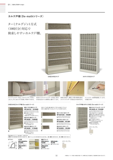 01スタッフステーションカルテ戸棚〈De-mathシリーズ〉ターミナルデジット方式(100区分)対応で検索しやすいカルテ戸棚。100区分対応タイプA4サイズ対応タイプカルテフォルダーの出し入れがしやすい形状にしました。爪に当たらず、快適に作業ができます。本体からカルテフォルダーの見出し部分が突き出るので、検索性に優れています。側板の突起で、棚板との間の隙間を塞ぎ、カルテフォルダーが挟まるのを防ぎます。アジャスターを標準装備しています。(前面2カ所)100区分対応カルテ戸棚〈De-mathシリーズ〉カルテ戸棚A4サイズ対応〈De-mathシリーズ〉❶W1200(基本タイプ)HP-SA412F1¥219,000外寸法/W1200×D320×H1790棚内寸法/W1160×D310×H260●仕切板ピッチ58mm1区分有効幅57mm※棚板の取り付けは変更できません。❷W900(基本タイプ)HP-SA49F1¥188,000外寸法/W900×D320×H1790棚内寸法/W860×D310×H260●仕切板ピッチ42mm1区分有効幅41mm❸W600(基本タイプ)HP-SA46F1¥178,000外寸法/W600×D320×H1790棚内寸法/W560×D310×H260●仕切板ピッチ28mm1区分有効幅27mm1段タイプは同じ幅の基本タイプまたは1段タイプの上に1段のみ連結可能です。卓上タイプとしても利用できます。●●●❹W12001段タイプ)HP-SA412SF1¥59,800外寸法/W1200×D320×H310棚内寸法/W1160×D310×H260❺W900(1段タイプ)HP-SA49SF1¥57,500外寸法/W900×D320×H310棚内寸法/W860×D310×H260❻W600(1段タイプ)HP-SA46SF1¥55,900外寸法/W600×D320×H310棚内寸法/W560×D310×H260●❶〜❻本体/スチール、焼付塗装仕切板/ABS●棚板1枚の耐荷重は980N(約100kgf)です。●オプションの仕切板を最下段に追加可能。❶〜❸●仕切板95枚付き❹〜❻●仕切板19枚付き❶A4カルテフォルダータイプHP-SA4EF1N¥153,000外寸法/W900×D320×H1790棚内寸法/W860×D307×H260本体・仕切板/スチール、焼付塗装●棚板の取付位置は変更できません。●仕切板42枚付き(HPS-SA4EF1N)●仕切板36mmピッチで可動、1段当たり21穴●A4、6段8列、計48区分●5mm厚のカルテフォルダーを1000冊(6段)収納が可能●棚板1枚の耐荷重は294N(約30kgf)です。カラーサンプル本体F1HPB-SA46F1¥5,700●W600用(1段分)カラーサンプル本体F150※価格はメーカー希望小売価格(税抜)です。消費税、組立・配送費などの諸経費を別途申し受けます。調節ブロックHPB-SA412F1¥6,400HPB-SA49F1¥6,000●W900用(1段分)●W1200用(1段分)調節ブロック仕切板HPS-SA4N19F1¥12,600HPS-SA4N1F1¥665●1段分、19枚セット●1枚のみ102598オプション267277