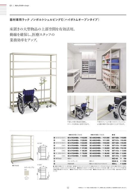 01スタッフステーション器材庫用ラックノンボルトシェルビングE(ハイボトムオープンタイプ)床置きの大型物品の上部空間を有効活用。動線を確保し、医療スタッフの業務効率をアップ。下部に大型の物品を収納し、スペースを有効に活用できます。下段のフレームで車イスのフットレストによる壁の傷や汚れを防ぐことができます。本体(H2100)天地4段本体(H1800)天地3段棚板W40H210040503636362392482392100W40122121656719240503636223239180012240❶〜❽本体・棚板/スチール、焼付塗装耐荷重/W1815・W1515・W1215棚板1枚当たり)1.47kN(約150kgf)、W890棚板1枚当たり)980N(約100kgf)、1台当たり:4.41kN(約450kgf)●棚段数/H1800タイプ:天地3段、H2100タイプ:天地4段●ハイボトムオープンタイプの最下段の棚板位置は最大H1400です。●棚板(天地4段)/4枚(ピッチ25mmで可動)●棚板(天地3段)/3枚(ピッチ25mmで可動)本体取り付け用ボルト付き5036403636239248239W210012165671924052※価格はメーカー希望小売価格(税抜)です。消費税、組立・配送費などの諸経費を別途申し受けます。12165671921221216567192H1800W405036362232391800122●天地4段カラーサンプル本体F1ナチュラルグレー