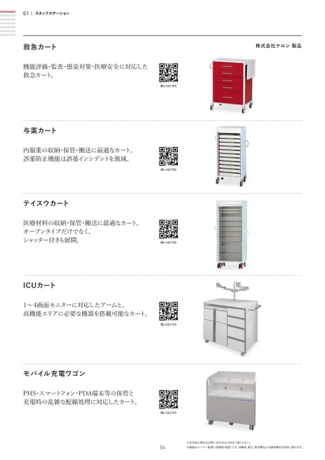 株式会社ケルン製品01スタッフステーション救急カート機能評価・監査・感染対策・医療安全に対応した救急カート。与薬カート内服薬の収納・保管・搬送に最適なカート。誤薬防止機能は誤薬インシデントを激減。詳しくはこちら詳しくはこちらテイスウカート医療材料の収納・保管・搬送に最適なカート。オープンタイプだけでなく、シャッター付きも展開。詳しくはこちらICUカート1~4画面モニターに対応したアームと、高機能エリアに必要な機器を搭載可能なカート。モバイル充電ワゴンPHS・スマートフォン・PDA端末等の保管と充電時の乱雑な配線処理に対応したカート。詳しくはこちら詳しくはこちら54※社外品に関するお問い合わせは、P.6をご覧ください。※価格はメーカー希望小売価格(税抜)です。消費税、組立・配送費などの諸経費を別途申し受けます。