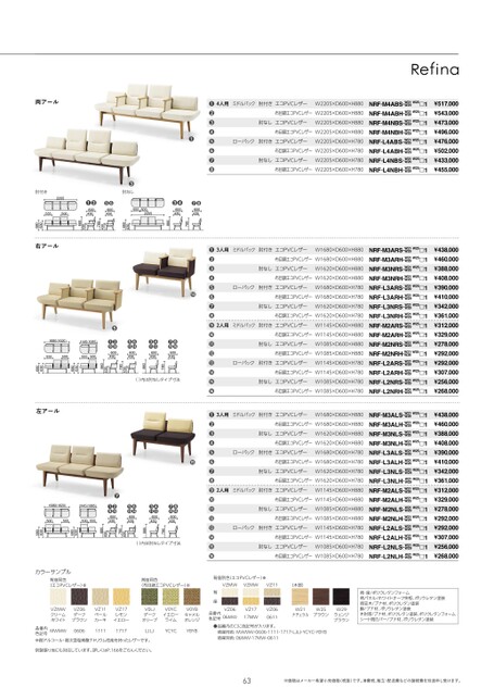 両アール●●●600430●●600430780880肘付き2205555500●肘なし●●600430●●6004305555002205430680430780430880630680NRF-M4AB(NRF-M4NB)NRF-L4AB(NRF-L4NB)右アール●●1680(1620)1145(1085)●❷●●●●●●●555500600430550060043055504305002205600430❹●●●600430●●●●600430NRF-M3AR(NRF-M3NR)NRF-M2AR(NRF-L3NR)NRF-ARNRM2NR)NRF-L2AR(NRF-L2NR)()内は肘なしタイプ寸法780880430780880430430680430780430880630680左アール6306801680(1620)1145(1085)●❷●●●●●●●5005556004300555600430600554305006004302205❹●●●600430●●●●600430NRF-M3AL(NRF-M3NL)NRF-L3ALNR-M2L(NRF-L3NL)(NRF-ML)NRF-L2AL(NRF-L2NL)()内は肘なしタイプ寸法カラーサンプル背座同色(エコPVCレザー)※背座同色(布目調エコPVCレザー)※背座別色(エコPVCレザー)※VZMWVZMWVZ11(木部)780880430780430430880680430780430880630680630680W21ナチュラルW25ブラウンW29ウェンジブラウン背・座/ポリウレタンフォーム背パネル/ホワイトオーク突板、ポリウレタン塗装背笠木/ブナ材、ポリウレタン塗装脚/ブナ材、ポリウレタン塗装木肘部/ブナ材、ポリウレタン塗装、ポリウレタンフォームシート間カバー/ブナ材、ポリウレタン塗装品番内色記号VZ0606MWVZ1717MWVZ060611背座●品番内の□に色記号が入ります。VZMWクリームホワイトVZ06ダークブラウンVZ11ペールカーキVZ17レモンイエローV0LJダークオリーブMWMW品番内色記号※耐アルコール・耐次亜塩素酸ナトリウム性能を持ったレザーです。171706061111LJLJV0YCイエローライムV0YBキャメルオレンジYCYCYBYB背座同色:MWMW・0606・1111・1717・LJLJ・YCYC・YBYB背座別色:06MW・17MW・0611別製張り地にも対応しています。詳しくはP.166をごらんください。63※価格はメーカー希望小売価格(税抜)です。消費税、組立・配送費などの諸経費を別途申し受けます。