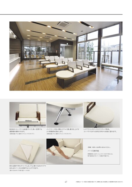 W500mmW500のコンパクトな座面サイズ。狭い空間でも通路幅を確保できます。(成型合板/アルミ脚タイプ〈コンパクトタイプ〉)メンテナンス性に優れたアルミ脚。磨き仕上げがより高級感を演出します。(成型合板/アルミ脚タイプ〈コンパクトタイプ〉)レイアウトしやすいサイドラウンド形状。コンパクトながらも楽な方向から自由に座れます。(別製)※詳しくはお問い合わせください。パーツ交換可能長期使用によるクッションのへたれや汚れには、背や座単位でのパーツ交換が可能です。思わぬ傷や汚れがついてしまっても、張りぐるみタイプであればカバーのみ交換することができます。(張りぐるみタイプの背・座シートのみ)67※価格はメーカー希望小売価格(税抜)です。消費税、組立・配送費などの諸経費を別途申し受けます。
