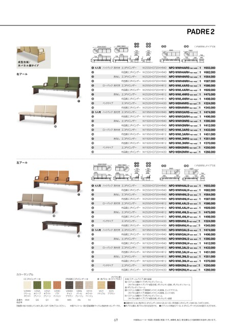 ●●()内は肘なしタイプ寸法7204957205901920φ7207204954305902520φ720720●●430NPD-WBN4NL(R)NPD-WBN3NL(R)●●1920()内は肘なしタイプ寸法720φ720720495590720495430027φ720●●2520590430NPD-WBN4NL(R)NPD-WBN3NL(R)430812430940430812NPD-WWH4AR(NPD-WWH4NR)NPD-WWL4AR(NPD-WWL4NR)NP-WH3NR)NPD-WWL3AR(NPD-WWL3NR)NP-WH3AR●●●●720612458720595458●●●●72059545872061245850φ7207204309406102550(2520)1950(1920)550720φ720610成型合板/木パネル脚タイプ右アールNPD-WWH4AL(NPD-WWH4NL)NPD-WWL4ALNPD-WWL4NL)NPD-WH3NL)NPD-WH3ALNPD-WWL3AL(NPD-WWL3NL)●●●●720612458720595458●●●●7205954581950(1920)027φ72061245855720430812430940430812430940612550(2520)027φ720550610左アール●●●●●カラーサンプル(エコPVCレザー)※(布目調エコPVCレザー)※脚・背パネル・肘(木パネル脚タイプのみ)VZMWクリームホワイトVZQ5オリーブグリーンVZQ1ホワイトグリーンVZ0DソフトタンジェリンV0MMチョコブラウンV0MLパールグレージュV01HホワイトベージュW21ナチュラルW25ブラウンMW品番内色記号別製張り地にも対応しています。詳しくはP.158をごらんください。Q5Q10DMMML1H本体/スチールパイプ、焼付塗装背/〈ステンレス調脚タイプ〉ポリウレタンフォーム〈木パネル脚タイプ〉ブナ成型合板、ポリウレタン塗装、ポリウレタンフォーム座/ポリウレタンフォーム脚/〈ステンレス調脚タイプ〉表面材:メラミン化粧板、エッジ:アクリル〈木パネル脚タイプ〉表面材:メラミン化粧板、エッジ:ABS肘/〈ステンレス調脚タイプ〉ポリウレタンフォーム〈木パネル脚タイプ〉ブナ成型合板、ポリウレタン塗装※耐アルコール・耐次亜塩素酸ナトリウム性能を持ったレザーです。●品番内の□には、色記号(エコPVCレザー)MW・Q5・Q1・0D、(布目調エコPVCレザー)MM・ML・1Hが入ります。●木パネル脚は、背パネル・肘の近似色です。●オプションの背座カバーは、エコPVCレザーからのみお選びいただけます。69※価格はメーカー希望小売価格(税抜)です。消費税、組立・配送費などの諸経費を別途申し受けます。