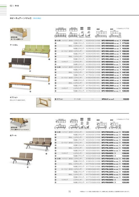 ●●2390()内は肘なしタイプ寸法●●1790550495590430550495NPD-WBN4NNNPD-WBN3NN5904304308124309404308124306109402450(2390)1850(1790)61245850595458●●●●612458●●●●595458()内は肘なしタイプ寸法600495540●●1772φ6006754306004955402322●●φ600675430NPD-PBN4NL(R)NPD-PBN3NL(R)2350(2325)φ60050067261070※価格はメーカー希望小売価格(税抜)です。消費税、組立・配送費などの諸経費を別途申し受けます。NPD-WWH4AN(NPD-WWH4NN)NPD-WWL4AN(NPD-WWL4NN)(NPD-WH3NN)NPD-WWL3AN(NPD-WWL3NN)NP-WWH3AN1800(1775)φ600612600458672600595458500●●●●612600458●●●●600595458430812430940430812610430940NPD-PWH4AR(NPD-PWH4NR)NPD-PWL4AR(NPD-PWL4NR)NPD-PWH3AR(NPD-WH3NR)NPD-PWL3AR(NPD-PWL3NR)550610●●02待合ロビーチェアー〈パドレ2〉〈受注生産品〉成型合板/木パネル脚タイプアールなし●●オプション肘なしタイプに追加できます。成型合板/アルミ脚タイプ〈コンパクトタイプ〉右アール●●