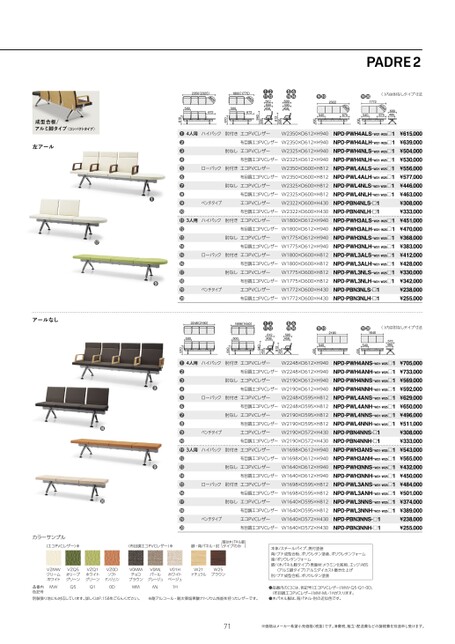 ●●2322●●1772()内は肘なしタイプ寸法600495φ600675540430600495φ600675NPD-PBN4NL(R)NPD-PBN3NL(R)540430●●2190●●1640()内は肘なしタイプ寸法572495540430572495NPD-PBN4NNNPD-PBN3NN540430NPD-PWH4AL(NPD-PWH4NL)NPD-PWL4AL(NPD-PWL4NL)PD-PWH3AL(NPD-WH3NL)NPD-PWL3AL(NPD-PWL3NL)430812430940430812610430940●●●●612600458●●●●600595458φ600600595458672612600458500φ6006722350(2325)1800(1775)500610成型合板/アルミ脚タイプ〈コンパクトタイプ〉左アール2248(2190)1698(1640)●●●●612458●●●●595458612458500595458NPD-PWH4AN(NPD-PWH4NN)NPD-PWL4AN(NPD-PWL4NN)PD-PWH3AN(PD-WH3NN)NPD-PWL3AN(NPD-PWL3NN)430812430940430812610430940500610アールなし●●●●●●●カラーサンプル(エコPVCレザー)※(布目調エコPVCレザー)※脚・背パネル・肘(脚は木パネル脚タイプのみ)VZMWクリームホワイトVZQ5オリーブグリーンVZQ1ホワイトグリーンVZ0DソフトタンジェリンV0MMチョコブラウンV0MLパールグレージュV01HホワイトベージュW21ナチュラルW25ブラウンMW品番内色記号別製張り地にも対応しています。詳しくはP.158をごらんください。MM0DQ5Q1ML1H※耐アルコール・耐次亜塩素酸ナトリウム性能を持ったレザーです。本体/スチールパイプ、焼付塗装背/ブナ成型合板、ポリウレタン塗装、ポリウレタンフォーム座/ポリウレタンフォーム脚/木パネル脚タイプ〉表面材:メラミン化粧板、エッジ:ABS肘/ブナ成型合板、ポリウレタン塗装〈アルミ脚タイプ〉アルミダイカスト磨き仕上げ●品番内の□には、色記号(エコPVCレザー)MW・Q5・Q1・0D、(布目調エコPVCレザー)MM・ML・1Hが入ります。●木パネル脚は、背パネル・肘の近似色です。71※価格はメーカー希望小売価格(税抜)です。消費税、組立・配送費などの諸経費を別途申し受けます。