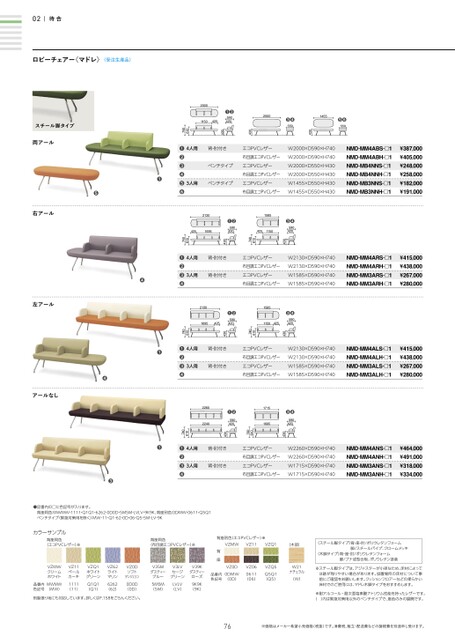 ❶4人用背・肘付きエコPVCレザーW2000×D590×H740NMD-MM4ABS-¡1¥387,000❷布目調エコPVCレザーW2000×D590×H740NMD-MM4ABH-¡1¥405,000❸ベンチタイプエコPVCレザーW2000×D550×H430NMD-MB4NNS-¡1¥248,000❹布目調エコPVCレザーW2000×D550×H430NMD-MB4NNH-¡1¥258,000❺3人用ベンチタイプエコPVCレザーW1455×D550×H430NMD-MB3NNS-¡1¥182,000❻布目調エコPVCレザーW1455×D550×H430NMD-MB3NNH-¡1¥191,000430NMD-MB4NNNMD-MB3NN2000●●5501455●●55020001150425❷●590420430430NMD-MM4AB610740213015854251695❷●590420●●5904204251150430NMD-MM3AR610740430NMD-MM4AL(R)61074021301585❷●5904201695425●●5904201150425430NMD-MM3AL610740430NMD-MM4AL(R)610740430NMD-MM3AN17151695●●59042022602240❷●590420610740430NMD-MM4AN610740●●●●02待合ロビーチェアー〈マドレ〉〈受注生産品〉スチール脚タイプ両アール●右アール左アールアールなし●●76※価格はメーカー希望小売価格(税抜)です。消費税、組立・配送費などの諸経費を別途申し受けます。(スチール脚タイプ)背・座・肘/ポリウレタンフォーム脚/スチールパイプ、クロームメッキ(木脚タイプ)背・座・肘/ポリウレタンフォーム脚/ブナ成型合板、ポリウレタン塗装※スチール脚タイプは、アジャスターが小径なため、床材によっては跡が残りやすい場合があります。設置場所の床材について事前にご確認をお願いします。クッションフロアーなどの柔らかい床材でのご使用には、マドレ木脚タイプをおすすめします。※耐アルコール・耐次亜塩素酸ナトリウム性能を持ったレザーです。()内は緊急対策用以外のベンチタイプで、座色のみの展開です。●品番内の□に色記号が入ります。背座同色:MWMW・1111・Q1Q1・6262・0D0D・5M5M・LVLV・9K9K、背座別色:0DMW・0611・Q5Q1ベンチタイプ(緊急対策用を除く):MW・11・Q1・62・0D・06・Q5・5M・LV・9Kカラーサンプル背座同色(エコPVCレザー)※背座同色(布目調エコPVCレザー)※背座別色(エコPVCレザー)※VZMWVZ11VZQ1(木部)VZ0D0DMW(0D)VZ060611(06)VZQ5Q5Q1(Q5)品番内色記号W21ナチュラル(W)背座VZMWクリームホワイトMWMW(MW)VZ11ペールカーキ1111(11)VZQ1ホワイトグリーンQ1Q1(Q1)VZ62ライトマリン6262(62)VZ0Dソフトタンジェリン0D0D(0D)品番内色記号V35Mダスティーブルー5M5M(5M)V3LVセージグリーンLVLV(LV)別製張り地にも対応しています。詳しくはP.158をごらんください。V39Kダスティーローズ9K9K(9K)