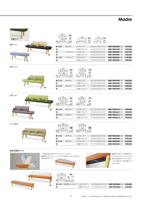❶4人用背・肘付きエコPVCレザーW2000×D590×H740NMD-WM4ABS-¡1¥418,000❷布目調エコPVCレザーW2000×D590×H740NMD-WM4ABH-¡1¥438,000❸ベンチタイプエコPVCレザーW2000×D550×H430NMD-WB4NNS-¡1¥267,000❹布目調エコPVCレザーW2000×D550×H430NMD-WB4NNH-¡1¥282,000❺3人用ベンチタイプエコPVCレザーW1455×D550×H430NMD-WB3NNS-¡1¥196,000❻布目調エコPVCレザーW1455×D550×H430NMD-WB3NNH-¡1¥205,000NMD-WB4NNNMD-WB3NN4302000●●5501455●●55020001150425●●590420430430NMD-WM4AB610740●21304251695●●59042015854251150●●590420430NMD-WM3AR610740430NMD-WM4AL(R)61074021301695425●●59042015851150425●●590420430NMD-WM3AL610740430NMD-WM4AL(R)610740●590420●●430NMD-WM3AN17151695610740590420●●430NMD-WM4AN22602240610740●●木脚タイプ両アール●右アール左アール●アールなし77※価格はメーカー希望小売価格(税抜)です。消費税、組立・配送費などの諸経費を別途申し受けます。●●775615390NMD-WE3NN43019301800720●緊急対策用ベンチ一度背を前に倒すとフルリクライニングし、緊急時にはソファーベッドとしてお使いいただけます。(緊急対策用ベンチ)①②通常時に誤って背が倒れることがないよう、ベルトによる安全対策を行っています。ベルトを外すと、背が動くようになります。