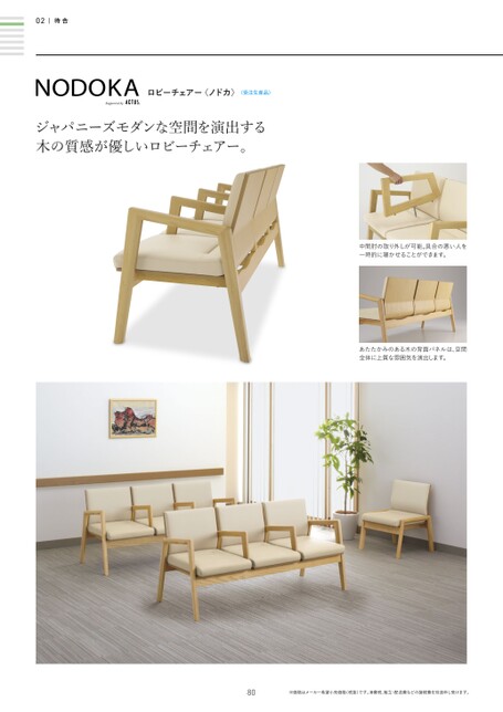 02待合ロビーチェアー〈ノドカ〉〈受注生産品〉ジャパニーズモダンな空間を演出する木の質感が優しいロビーチェアー。中間肘の取り外しが可能。具合の悪い人を一時的に寝かせることができます。あたたかみのある木の背面パネルは、空間全体に上質な雰囲気を演出します。80※価格はメーカー希望小売価格(税抜)です。消費税、組立・配送費などの諸経費を別途申し受けます。