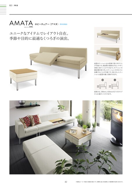 02待合ロビーチェアー〈アマタ〉〈受注生産品〉ユニークなアイテムでレイアウト自在。季節や目的に最適なくつろぎの演出。座面のクッションはお客様で取り外すことが可能です。背座間の掃除を行ないやすく清潔に保つことができます。オプションの雑誌棚を取り外したクッションの代わりに設置することが可能です。取り外したクッションは座面の裏に収納できます。MMHH390mm390mm420mm420mm座高さは、390mm、420mmの2つのタイプからお選びいただけます。82※価格はメーカー希望小売価格(税抜)です。消費税、組立・配送費などの諸経費を別途申し受けます。