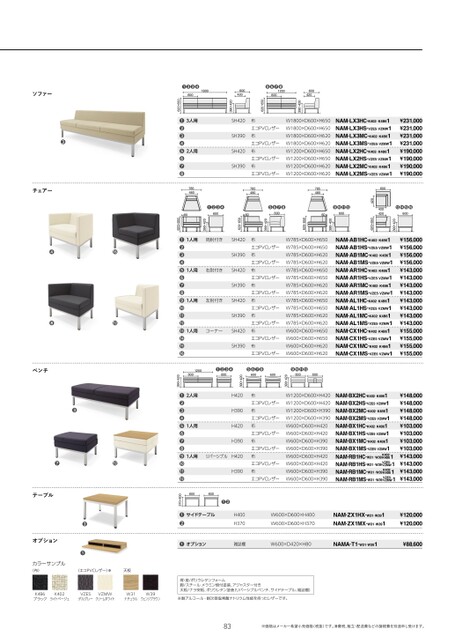 ●●●●600NAM-CX1390・420600420420420620・650●●●●6000NAM-AB1NAM-AR(L)1390・420390・4206060620・650●●●●600NAM-AR(L)1390・42060620・650●●●●600NAM-AB1390・42060620・650チェアー785480785480785785480480NAM-LX2600420390・420●●●●1200600620・650NAM-LX3600420390・420●●●●6001800620・650ソファー●NAM-BX2NAM-BX1NAM-RB1●●●●600600390・420●●●●600600390・4201200600●●●●600390・420600600●●NAM-ZX1370・400●●●●ベンチ●●●テーブルオプション●●カラーサンプル(布)(エコPVCレザー)※天板K4B6ブラックK402ライトベージュVZE5ダルグレーVZMWクリームホワイトW31ナチュラルW39ウェンジブラウン背・座/ポリウレタンフォーム脚/スチールメラミン焼付塗装、アジャスター付き天板/ナラ突板、ポリウレタン塗装(リバーシブルベンチ、サイドテーブル、雑誌棚)※耐アルコール・耐次亜塩素酸ナトリウム性能を持ったレザーです。83※価格はメーカー希望小売価格(税抜)です。消費税、組立・配送費などの諸経費を別途申し受けます。