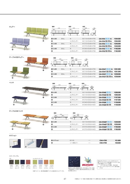 87※価格はメーカー希望小売価格(税抜)です。消費税、組立・配送費などの諸経費を別途申し受けます。背・座/ポリプロピレン、モールドポリウレタン脚/アルミダイカスト、焼付塗装、アジャスター付き天板/表面材:メラミン化粧板エッジ:ポリウレタン塗装芯材:MDF肘/スチールパイプ37×14、メラミン焼付塗装、ブナ材●●5485004501575●●548500401040548450CN-4704CN-4703CN-47024287904287904282110●●500790548450CN-4703T428❷●5002110485●●5484505001575485CN-4704T400428790400790550●●1040550500425CN-4703BCN-4702B●●5505001575CN-4704B4252110●●500425550CN-4703BT❷●5002110485●●5505001575485400425CN-4704BT400425●●●●チェアー●テーブル付きチェアー●ベンチ●テーブル付きベンチ●オプション●●カラーサンプル(布)(エコPVCレザー)※G8EKマウスグレーG8LJダークオリーブG866ダークマリンG8A3モデレートコーラルVZQ1ホワイトグリーンVZ62ライトマリンVZ0DソフトタンジェリンVZ1Bイエローオーカー※耐アルコール・耐次亜塩素酸ナトリウム性能を持ったレザーです。撥水性、止水性、透湿性を持ち、汚れも落としやすい布張り地を使用しています。撥水性は使用状況により、持続性が異なります。)