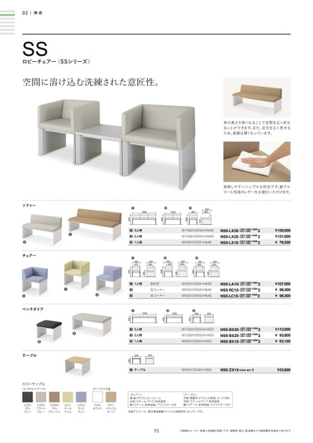 背の高さが低くなることで空間を広く見せることができます。また、足元を広く見せるため、座面は薄くなっています。掃除しやすいシンプルな形状です。耐アルコール性能のレザーをお選びいただけます。●550420550420●550420550420CN-1501U90RCN-1501U90L420640420640550420CN-1501A420●550470640CN-1503CN-1502CN-15014206404206404201500●5504201000●550420500550420●640●CN-1502BCN-1501B420420CN-1503B1500●5501000●550500550●420●●●VZL1ペールライムVZ62ライトマリンPAWホワイトMT1ナチュラルオーク〈チェアー〉背・座/ポリウレタンフォーム本体/スチールパイプ、粉体塗装脚/スチール、粉体塗装、アジャスター付き〈テーブル〉天板/表面材:メラミン化粧板、エッジ:ABS本体/スチールパイプ、粉体塗装脚/スチール、粉体塗装、アジャスター付き※耐アルコール・耐次亜塩素酸ナトリウム性能を持ったレザーです。90※価格はメーカー希望小売価格(税抜)です。消費税、組立・配送費などの諸経費を別途申し受けます。CN-1500T1550540360〈テーブル〉天板ソファー●チェアー●ベンチタイプ●テーブルカラーサンプル(エコPVCレザー)※VZE5ダルグレーVZENブライトグレーVZMNモカグレージュ02待合ロビーチェアー〈SSシリーズ〉空間に溶け込む洗練された意匠性。