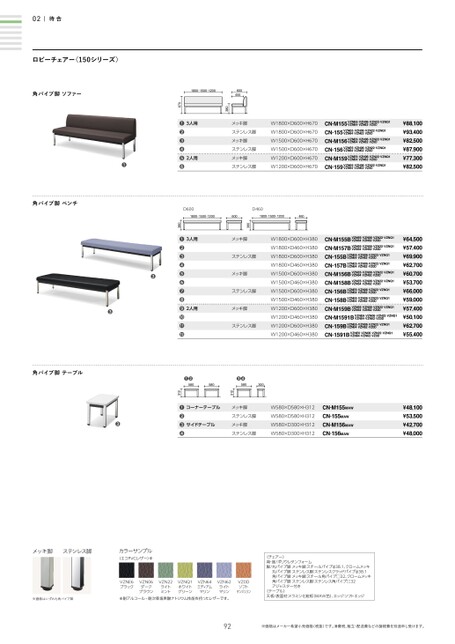 D460(背なし)380D600背なし)D600D4601800・1500・12006001800・1500・1200460D600ローバック)3801800・1500・1200600455670380●●●●●02待合ロビーチェアー〈150シリーズ〉角パイプ脚ソファー角パイプ脚ベンチ角パイプ脚テーブル●●●メッキ脚ステンレス脚カラーサンプル(エコPVCレザー)※※画像はいずれも角パイプ脚VZNE6ブラックVZN06ダークブラウンVZN62ライトマリン※耐アルコール・耐次亜塩素酸ナトリウム性能を持ったレザーです。VZNQ1ホワイトグリーンVZN64ミディアムマリンVZN22ライトミントVZ0Dソフトタンジェリン〈チェアー〉背・座/ポリウレタンフォーム脚/丸パイプ脚メッキ脚:スチールパイプφ38.1、クロームメッキ丸パイプ脚ステンレス脚:ステンレスクラッドパイプφ38.1角パイプ脚メッキ脚:スチール角パイプ□32、クロームメッキ角パイプ脚ステンレス脚:ステンレス角パイプ□32アジャスター付き〈テーブル〉天板/表面材:メラミン化粧板(MAW色)、エッジ:ソフトエッジ92※価格はメーカー希望小売価格(税抜)です。消費税、組立・配送費などの諸経費を別途申し受けます。