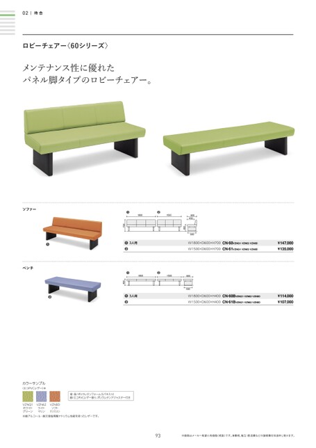 CN-60CN-615001800●1500600CN-60BCN-61B50093※価格はメーカー希望小売価格(税抜)です。消費税、組立・配送費などの諸経費を別途申し受けます。700●400カラーサンプル(エコPVCレザー)※背・座/ポリウレタンフォーム(Sバネ入り)脚/エコPVCレザー張り、ポリウレタンアジャスター付きVZN0DVZN62ライトマリンVZNQ1ホワイトグリーン※耐アルコール・耐次亜塩素酸ナトリウム性能を持ったレザーです。ソフトタンジェリン600450400●1800●1500ソファーベンチ●●02待合ロビーチェアー〈60シリーズ〉メンテナンス性に優れたパネル脚タイプのロビーチェアー。