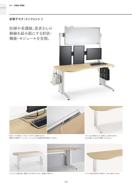 03診察室・処置室診察デスク〈インフォントi〉医師や看護師、患者さんの動線を最小限にする形状・機能・モジュールを実現。OAタップや余長コードをコードダクトに収納できます。開閉式の配線カバーにより、パソコンなどの配線作業が簡単にできます。デスクはL型脚のため、患者さんが体の向きを変える際にも、足元の邪魔になりません。コンセント位置が高い壁際でも干渉することなく、設置が可能です。デスク天板はR形状で患者さんに安心感を与えます。100