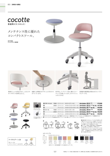 03診察室・処置室患者用イス〈ココット〉メンテナンス性に優れたコンパクトスツール。2017年度グッドデザイン賞受賞背面のシェルは凹凸がなく、ふきとりやすいデザインを採用しました。座裏には移動させやすいよう手がかりがついています。防汚性、メンテナンス性に優れたコーティングを施しています。(ホワイトシェルタイプのみ)回転脚の脚部幅は490mmのコンパクトチェアーです。●品番末尾の(-W)は、カーペットのような柔らかい床に適した「ナイロンキャスター」仕様を、(-V)は、Pタイル、フローリング床などの硬くて滑りやすい床に適した「ゴム単輪キャスター」仕様を示しています。●キャスター交換をご希望の場合は、お客様相談室、または、お買い上げの販売店へご相談ください。※いずれのキャスターも、クッションフロアー上ではご使用にならないでください。床を傷つける場合があります。※円盤脚を引きずらないでください。床を傷つける場合があります。φ500490φ500490CR-CG542CR-G542CR-CG540CR-G540410~500φ420●●φ420●390~480420430410~500●●590~680420430390~480●570~660座/PP、クッション:モールドウレタン脚/円盤脚:アルミダイカスト回転脚:強化ナイロン、キャスター:(-W)車輪径φ60mm、-V)車輪径φ50mm●ホワイトシェルタイプの回転脚は防汚性、メンテナンス性に優れたクリーンテクトコーティング仕様です。(-W)A-CS18F6ナイロンキャスター(-V)A-CS25GE4・BKゴム単輪キャスター●●●●カラーサンプル本体背・座(エコPVCレザー)※ナースチェアーP.26同シリーズのミドルハイチェアーもあります。E1ホワイトグレーVZMDホワイトベージュ※耐アルコール・耐次亜塩素酸ナトリウム性能を持ったレザーです。VZL1ペールライムVZ92ライトローズVZ62ライトマリンVZ17レモンイエロー本体背・座(エコPVCレザー)※E6ブラックVZE6ブラックVZEAニュートラルグレーVZ64ミディアムマリン107※価格はメーカー希望小売価格(税抜)です。消費税、組立・配送費などの諸経費を別途申し受けます。