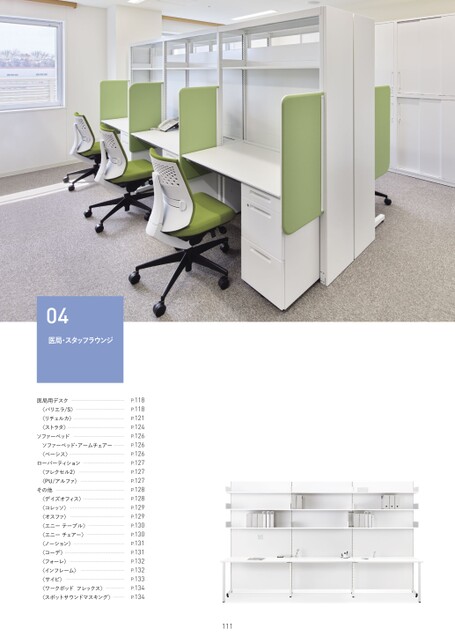 04医局・スタッフラウンジ医局用デスク〈バリエラ/S〉〈リチェルカ〉〈ストラタ〉ソファーベッドソファーベッド・アームチェアー〈ベーシス〉ローパーティション〈フレクセル2〉〈PU/アルファ〉その他〈デイズオフィス〉〈コレッソ〉〈オスファ〉〈エニーテーブル〉〈エニーチェアー〉〈ノーション〉〈コーデ〉〈フォーレ〉〈インフレーム〉〈サイビ〉〈ワークポッドフレックス〉〈スポットサウンドマスキング〉P.118P.118P.121P.124P.126P.126P.126P.127P.127P.127P.128P.128P.129P.129P.130P.130P.131P.131P.132P.132P.133P.134P.134111