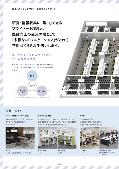 医局・スタッフラウンジ空間づくりのポイント研究・情報収集に「集中」できるプライベート環境と、医師同士の交流の場として「多様なコミュニケーション」がとれる空間づくりをお手伝いします。Aワークスタイルで活性化されるチーム医療の推進集中、コミュニケーション、リフレッシュ、それぞれのエリアを設けることで、オンとオフの切り替えがしやすくなり、メリハリのある働き方を促します。集中メリハリコミュニケーションリフレッシュスタッフラウンジエリアAA集中エリアデスク+収納棚+ロッカー(個室)Web会議や研究などが多い医師にはより集中できる個室環境がおすすめです。デスク+上部本棚目の前やサイドを仕切ることで、周りが気にならない集中環境を作り出します。また、デスク上部に書棚がつけられるため、収納量が確保できます。デスク上部棚のないデスクは、研修医など誰もが気軽に座れ、見通しの良い空間を作れます。サイビP.133ß2025版総合カタログF編P.524〜バリエラ/SP.118リチェルカP.121ストラタP.124ワークヴィスタ+ß2025版総合カタログF編P.304〜112