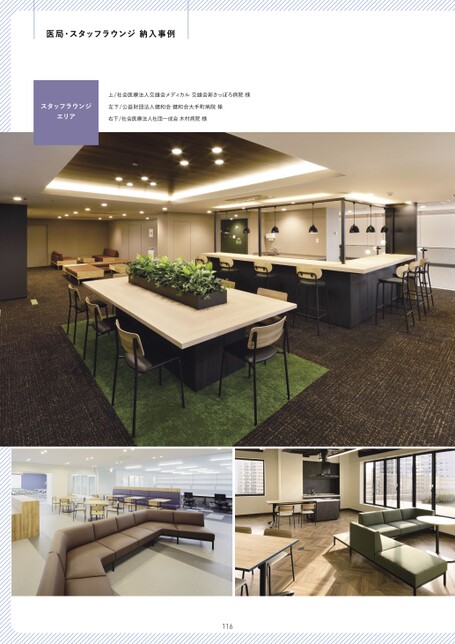 医局・スタッフラウンジ納入事例上/社会医療法人交雄会メディカル交雄会新さっぽろ病院様スタッフラウンジエリア左下/公益財団法人健和会健和会大手町病院様右下/社会医療法人社団一成会木村病院様116