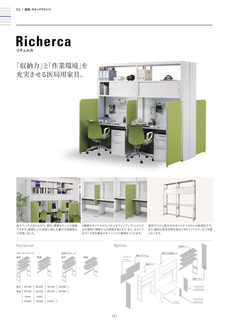 04医局・スタッフラウンジリチェルカ「収納力」と「作業環境」を充実させる医局用家具。省スペースでありながら、資料・書籍をたっぷり収納できます。書類などの保管に適した鍵付き収納庫もご用意しました。2種類のサイドクロスパネルをラインアップ。小タイプは作業時に隣席からの視線を遮ります。また、大タイプはブース型を構成できパーソナル環境をつくれます。既存デスクに組み合せることができるため経済的です。また、軽快な医局空間を演出するホワイトカラーをご用意しています。Variationスタンダードラック基本増連収納付きラック基本増連Option背面パネル(上)マグネットパネル基本タイプ増連タイプ収納付き増連タイプ基本増連W1490W1450D445H2500W1290W1250D345H2160W1190W1150W1090W1050H1875121側面パネルサイドクロスパネル(大)サイドクロスパネル(小)デスク