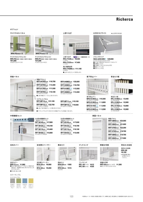 オプションサイドクロスパネル上部つなぎLEDタスクライト★山田照明(株)製品RFK-P2HSNQ1×2サイドクロスパネル(大)RFK-P2HSNE1・HSNQ1・HSNT3・HSN1U¥61,200W680×D26×H1300RFK-P1HSNQ1×2サイドクロスパネル(小)RFK-P1HSNE1・HSNQ1・HSNT3・HSN1U¥37,200W390×D26×H820M8×15SEB-815Z)×4個L=2600上部つなぎRFA-TC26SAW¥8,400RFA-TC23SAW¥7,400L=2300高さ調節金具RFA-TH288SAW¥11,100H288用●上部つなぎとセットで使用します。クランプタイプSDA-LEDC20NΩ¥29,900外寸法/W328×D568×H495●中心直下照度(高さ400mm)/1540ルクス●消費電力/9.0W●定格電圧/100V(50/60Hz共用)●電源コード/1.8m●専用クランプ付き背面パネル落下防止バー背当たり板背面ブレース背面ブレースW1400×H2160用背面パネル上RFP-H47KESAW¥16,700RFP-H27KESAW¥13,300RFP-H17KESAW¥11,500RFP-H07KESAW¥10,100W1200×H2160用W1100×H2160用W1000×H2160用●上部の背面ブレースの上に取り付けます。W1200×H2500用W1400×H2500用RFP-H48KESAW¥20,000RFP-H28KESAW¥16,700RFP-H18KESAW¥15,000RFP-H08KESAW¥13,300W1100×H2500用W1000×H2500用マグネットパネルRFP-MP14SAW¥31,100RFP-MP12SAW¥22,700W1400デスク対応用W1200デスク対応用●上部と下部の背面ブレースの間に取り付けます。W1100デスク対応用RFP-MP11SAW¥19,100RFP-MP10SAW¥18,500W1000デスク対応用●マグネットパネルの下に取り付ける「背面パネル下」は別製にて承ります。W1400デスク対応用落下防止バーMFD-614KESAW¥10,300MFD-612KESAW¥6,8006,400MFD-611KESAW¥MFD-610KESAW¥6,200W1200デスク対応用W1100デスク対応用W1000デスク対応用W1400対応用背当たり板RFL-514KESAW¥3,400RFL-512KESAW¥2,900RFL-511KESAW¥2,800RFL-510KESAW¥2,800W1200対応用W1100対応用W1000対応用中間棚板セット側面パネルA4用中間棚板セット(棚板奥行寸法d=150)W1400デスク対応用W1200デスク対応用RFT-M142SAW¥17,000RFT-M122SAW¥16,100RFT-M112SAW¥15,400RFT-M102SAW¥15,000W1100デスク対応用W1000デスク対応用B4用中間棚板セット(棚板奥行寸法d=150)W1200デスク対応用W1400デスク対応用RFT-M143SAW¥17,600RFT-M123SAW¥16,700RFT-M113SAW¥16,100RFT-M103SAW¥15,400W1100デスク対応用W1000デスク対応用外寸法/W345×H2500外寸法/W445×H2500側面パネルRFP-38KESAW¥25,000RFP-28KESAW¥21,600RFP-37KESAW¥22,200RFP-27KESAW¥19,700RFP-36KESAW¥19,700RFP-26KESAW¥17,000外寸法/W445×H2160外寸法/W345×H2160外寸法/W445×H1875外寸法/W345×H1875支柱カバー支柱間スペーサー側あたりブックエンド移動仕切板側あたり板背合わせ金具背合わせ金具RFK-SE¥9,100※島型配置の際は必ず取り付けてください。支柱間スペーサーRFA-S3SAW¥6,900RFA-S2SAW¥6,200D455用D345用支柱カバーRFK-C1SAW¥1,900●支柱の開口部をカバーすることで意匠性を高めます。背面側の支柱に取り付けることをおすすめします。●支柱高さ違い共通カラーサンプルサイドクロスパネルHSNE1ホワイトグレーHSNQ1ホワイトグリーンHSNT3ソフトブルーHSN1Uモデレートイエロー側あたりRFN-S3SAW¥365RFN-S2SAW¥315D445用D345用ブックエンドRFL-A4(A4用)RFL-B4(B4用)¥415¥530移動仕切板RFD-A4SAW(A4・B4用)¥1,300棚板上/H180×D290×W50123※価格はメーカー希望小売価格(税抜)です。消費税、組立・配送費などの諸経費を別途申し受けます。