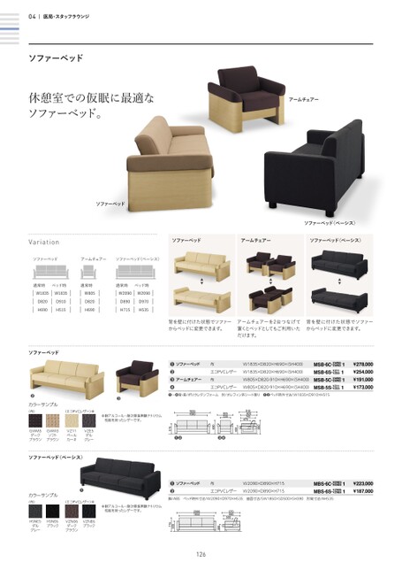 04医局・スタッフラウンジソファーベッド休憩室での仮眠に最適なソファーベッド。アームチェアーソファーベッドVariation805530ソファーベッド18351560910820745アームチェアー0553047518351560ソファーベッド〈ベーシス〉20901850910820745475ソファーベッドアームチェアーソファーベッド〈ベーシス〉ソファーベッド〈ベーシス〉970890500背を壁に付けた状態でソファーからベッドに変更できます。アームチェアーを2台つなげて置くとベッドとしてもご利用いただけます。背を壁に付けた状態でソファーからベッドに変更できます。690390400535715515690690400HP-CE775通常時W805D820H690HP-CE773通常時W2090D890H715ベッド時W2090D970H535●❶〜❹背・座/ポリウレタンフォーム肘/オレフィン系シート張り❶❷ベッド時外寸法/W1835×D910×H515910820745475690400HP-CE7731835156069091082074547569055400690400515690515690HP-CE775HP-CE775●●HP-CE773HP-CE773HP-CE775●●VZ11ペールカーキVZE5ダルグレー(エコPVCレザー)※※耐アルコール・耐次亜塩素酸ナトリウム性能を持ったレザーです。8055301835156080553018351560910805820530745475脚/ABSベッド時外寸法/W2090×D970×H535座面寸法/SW1850×SD500×SH390肘高寸法/AH53520901850970890500390535715※耐アルコール・耐次亜塩素酸ナトリウム性能を持ったレザーです。126ソファーベッド〈ベーシス〉カラーサンプル(布)●(エコPVCレザー)※HSNE5ダルグレーHSNE6ブラックVZN06ダークブラウンVZNE6ブラックHP-CE773通常時ベッド時W1835D910H515W1835D820H690515690HP-CE775ソファーベッド●カラーサンプル(布)GWM5ダークブラウンGWM3ソフトブラウン