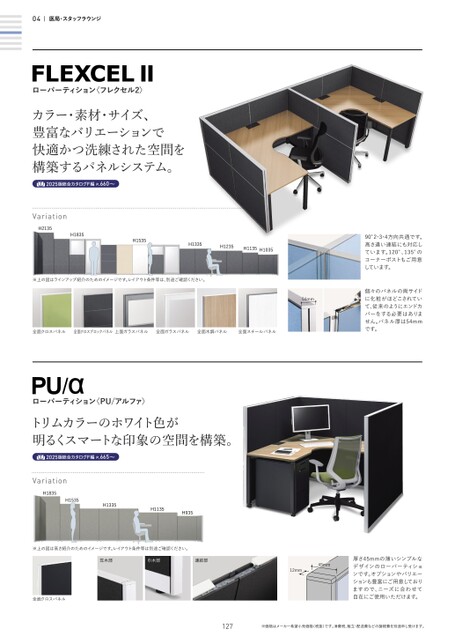 04医局・スタッフラウンジローパーティション〈フレクセル2〉カラー・素材・サイズ、豊富なバリエーションで快適かつ洗練された空間を構築するパネルシステム。ß2025版総合カタログF編P.660〜VariationH2135H1835H1535H1335H1235H1135H1035※上の図はラインアップ紹介のためのイメージです。レイアウト条件等は、別途ご確認ください。54mm全面クロスパネル全面クロスブロックパネル上面ガラスパネル全面ガラスパネル全面木調パネル全面スチールパネル90°2・3・4方向共通です。高さ違い連結にも対応しています。120°、135°のコーナーポストもご用意しています。個々のパネルの両サイドに化粧がほどこされていて、従来のようにエンドカバーをする必要はありません。パネル厚は54mmです。ローパーティション〈PU/アルファ〉トリムカラーのホワイト色が明るくスマートな印象の空間を構築。ß2025版総合カタログF編P.665〜VariationH1835H1535H1335H1135H935※上の図は高さ紹介のためのイメージです。レイアウト条件等は別途ご確認ください。笠木部巾木部連結部全面クロスパネル45mm12mm厚さ45mmの薄いシンプルなデザインのローパーティションです。オプションやバリエーションも豊富にご用意しておりますので、ニーズに合わせて自在にご使用いただけます。127※価格はメーカー希望小売価格(税抜)です。消費税、組立・配送費などの諸経費を別途申し受けます。