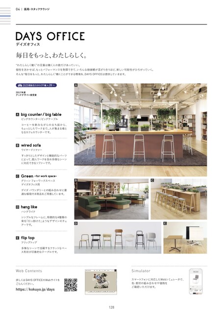04医局・スタッフラウンジデイズオフィス毎日をもっと、わたしらしく。“わたしらしく働く”の定義は働く人の数だけあっていい。個性を活かせば、もっとパフォーマンスを発揮できて、いろんな価値観が混ざり合うほど、新しい可能性がひろがっていく。そんな“毎日をもっと、わたしらしく”働くことができる環境を、DAYSOFFICEは提供していきます。ß2025版総合カタログF編P.28〜A2017年度グッドデザイン賞受賞ABCDEビッグカウンター/ビッグテーブルコーヒーを飲みながらの立ち話から、ちょっとしたワークまで。人が集まる場となるカフェカウンターです。ワイヤードソファーすっきりとしたデザインと機能的なパーツによって、個人ワークを含め多様なシーンに対応できるソファーです。グリーンフォーワークスペースデイズオフィス用デイズバウンダリーとの組み合わせに最適な植栽付き商品をご用意しています。ハングライクシンプルなフレームに、特徴的な4種類の背を「引っ掛けた」ようなデザインのチェアーです。フリップトップ多様なシーンで活躍するフラットなベース形状が印象的なテーブルです。WebContents詳しくはDAYSOFFICEのWebサイトをごらんください。https://kokuyo.jp/daysBDCESimulatorスマートフォンに対応したWebシミュレータで、色・素材の組み合わせや価格をご確認いただけます。128