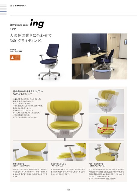 05事務用回転イスイング人の体の動きに合わせて360°グライディング。2018年度グッドデザイン賞受賞体の自由な動きをさまたげない360°グライディングは、2層のメカの組み合わせによって、前傾、後傾、左右のひねりまで、体のどんな動きにも追随。バネを使用しない、ブランコのようなメカは、動きはじめの負荷をなくし、体を動かしやすくしてくれます。さらに、動いた後は揺り戻しがあるため、バランスを崩すことなく、安心して体を預けることができます。背骨を解放する「ランバーレスデザイン」安心して体をゆらせる「グリップアーム」PCワークに対応する「可動式グリップアーム」360°グライディングが、背骨のS字カーブを自然につくるため、背もたれにランバーサポートはありません。背骨がより解放され、体が動かしやすくなります。肘は完全固定タイプ。パッド前側はクッション材で覆われた構造のため、グリップしながら安心して体をゆらすことができます。PCワーク時の腕をサポートするため、上下方向と内側回転の可動機能を拡張。固定タイプ同様、肘と背座は連動して動かない構造で、肘パッドをしっかりとグリップして体をゆらせます。上下ストローク:100mm、角度:内側60°136