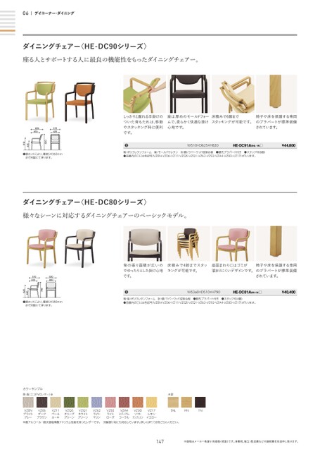 しっかりと握れる手掛けのついた背もたれは、移動やスタッキング時に便利です。座は厚めのモールドフォームで、柔らかく快適な掛け心地です。床積みで6脚までスタッキングが可能です。椅子や床を保護する専用のプラパートが標準装備されています。背/ポリウレタンフォーム座/モールドウレタン肘・脚/ラバーウッド成型合板●脚先プラパート付き●スタック可(6脚)●品番内の□には色記号(VZEN・VZ06・VZ11・VZQ5・VZQ1・VZ62・VZ92・VZA4・VZ0D・VZ17)が入ります。625450510425●脚カットにより、最低SH360mmまで別製にて承ります。820435610ダイニングチェアー〈HE-DC80シリーズ〉様々なシーンに対応するダイニングチェアーのベーシックモデル。背の張り面積が広いのでゆったりとした掛け心地です。床積みで4脚までスタッキングが可能です。座面まわりにはゴミが溜まりにくいデザインです。椅子や床を保護する専用のプラパートが標準装備されています。背・座/ポリウレタンフォーム肘・脚/ラバーウッド成型合板●脚先プラパート付き●スタック可(4脚)●品番内の□には色記号(VZEN・VZ06・VZ11・VZQ5・VZQ1・VZ62・VZ92・VZA4・VZ0D・VZ17)が入ります。●脚カットにより、最低SH380mmまで別製にて承ります。51043553046079044062506デイコーナー・ダイニングダイニングチェアー〈HE-DC90シリーズ〉座る人とサポートする人に最良の機能性をもったダイニングチェアー。カラーサンプル背・座(エコPVCレザー)※木部VZENブライトグレーVZ06ダークブラウンVZ62ライトマリン※耐アルコール・耐次亜塩素酸ナトリウム性能を持ったレザーです。VZ11ペールカーキVZQ5オリーブグリーンVZQ1ホワイトグリーンVZ92ライトローズVZA4ミディアムコーラルVZ0DソフトタンジェリンVZ17レモンイエロー5NLHN1N別製張り地にも対応しています。詳しくはP.158をごらんください。147※価格はメーカー希望小売価格(税抜)です。消費税、組立・配送費などの諸経費を別途申し受けます。
