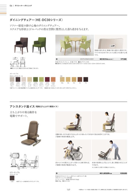 背裏の持ち手は、移動や持ち運びに便利です。ワイドが大きめでゆったりと柔らかな掛け心地です。背・座/ポリウレタンフォーム肘・脚/ブナ材●脚先プラパート付き●品番内の□には色記号(VZEN・VZ06・VZMD・VZ11・VZQ5・VZQ1・VZAK・VZ0D)が入ります。●脚カットにより、最低SH390mmまで別製にて承ります。565410575470830440625カラーサンプル背・座(エコPVCレザー)※木部06デイコーナー・ダイニングダイニングチェアー〈HE-DC30シリーズ〉ソファー感覚の掛け心地のダイニングチェアー。スクエアな形状とミドルバックの背は空間に整然とした落ち着きを与えます。VZENブライトグレーVZ11ペールカーキVZ06ダークブラウンVZQ1ホワイトグリーン※耐アルコール・耐次亜塩素酸ナトリウム性能を持ったレザーです。VZMDホワイトベージュVZQ5オリーブグリーンVZAKバーントレッドVZ0Dソフトタンジェリン5NL5NHN3N1N別製張り地にも対応しています。詳しくはP.158をごらんください。アシスタンド座イス(電動立ち上がり補助イス)立ち上がりや座る動作を電動でサポート。背・座・肘/ポリウレタンフォーム、耐アルコール性PVCレザー張り本体/スチール、メラミン焼付塗装ローラー/ナイロン耐荷重/980N(約100kgf)質量/28kg電源/AC100V149※価格はメーカー希望小売価格(税抜)です。消費税、組立・配送費などの諸経費を別途申し受けます。足腰の弱い方でも自力で立ち上がったり座ったりできるので自立を促すことができ、介護者の負担を軽減します。床からイスの高さに上がって車イスに乗り移れば、介護者の負担が軽減されます。本体の前側を上げることで、楽に移動させることができます。※人を乗せた状態での移動はできません。1235788685座位高さ49273586015°435座位高さ115360カラーサンプル(PVCレザー)※450(座巾)608※耐アルコール性能を持ったPVCレザーです。15°1235座位高さ492735860788685435高さ15360VZ06422(座巾)608