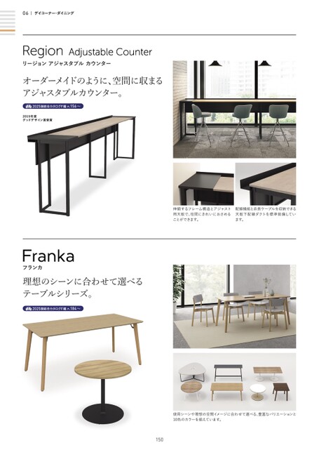 06デイコーナー・ダイニングリージョンアジャスタブルカウンターオーダーメイドのように、空間に収まるアジャスタブルカウンター。ß2025版総合カタログF編P.156〜2019年度グッドデザイン賞受賞フランカ理想のシーンに合わせて選べるテーブルシリーズ。ß2025版総合カタログF編P.184〜伸縮するフレーム構造とアジャスト用天板で、柱間にきれいにおさめることができます。配線機能と余長ケーブルを収納できる天板下配線ダクトを標準装備しています。使用シーンや理想の空間イメージに合わせて選べる、豊富なバリエーションと10色のカラーを揃えています。150