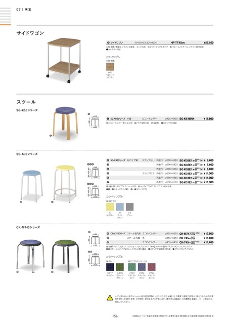 ❷SG-K30シリーズ丸パイプ脚ステップなし再生PPφ390×H380SG-K35E138Y2¿B1¿E3N¥8,400❸再生PPφ390×H420SG-K35E142Y2¿B1¿E3N¥8,400❹再生PPφ390×H460SG-K35E146Y2¿B1¿E3N¥8,400❺ステップ付き再生PPφ390×H420SG-K31E142Y2¿B1¿E3N¥11,000❻再生PPφ390×H460SG-K31E146Y2¿B1¿E3N¥11,000❼再生PPφ390×H500SG-K31E150Y2¿B1¿E3N¥11,000天板・棚板/表面材:メラミン化粧板エッジ:ABS芯材:パーティクルボード脚・フレーム/スチール、メラミン焼付塗装●キャスター付きカラーサンプル天板・棚板MP2ラスティックミディアム座/ビニールレザー張り、φ330脚/ブナ成型合板色/青(B)●スタック可(5脚)座/再生PP(ポリプロピレン)、φ300脚/丸パイプ(φ22.2)、メラミン焼付塗装●❷〜❹スタック可(10脚)❺〜❼スタック不可カラーサンプル座(再生PP)Y2イエローB1ライトブルーE3グレー座/座板:ポリプロピレンクッション:スラブウレタン脚/❽スチール長円パイプ14×37、クロームメッキ❾スチール丸パイプφ25.4、メラミン焼付塗装●スタック可能脚数/床5脚●スタックピッチ/75mm!レザー張り地は、耐アルコール・耐次亜塩素酸ナトリウムですが、必要以上の濃度や頻度で使用した場合やその他の消毒剤を使用した場合、変色・ひび割れ・変形することがあります。使用する消毒剤とその濃度は、製薬メーカーと相談の上、選定してください。156※価格はメーカー希望小売価格(税抜)です。消費税、組立・配送費などの諸経費を別途申し受けます。座(布)座(エコPVCレザー)※φ455CK-745450●●G4T7ネイビーG4Q5オリーブグリーンVZ24ミディアムミントVZ64ミディアムマリンVZ94ミディアムローズφ360カラーサンプルφ330φ425●430φ300φ390●φ300φ390380・420・460●●420・460・500●●●φ360φ455●45007病室サイドワゴンスツールSG-K50シリーズ●SG-K30シリーズ●●CK-M745シリーズCK-M747●●