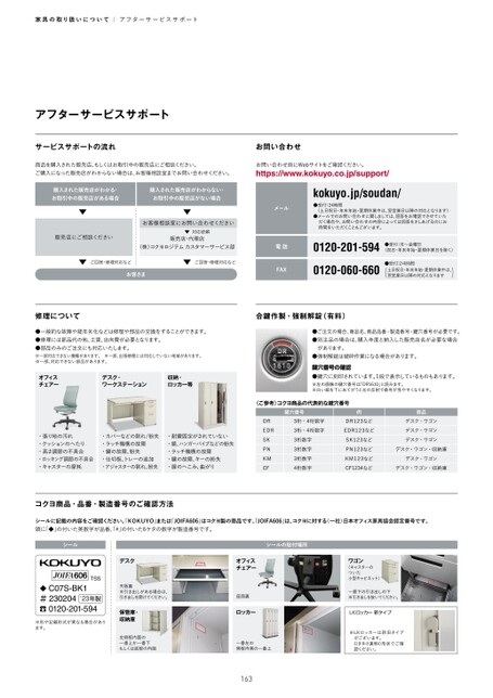 家具の取り扱いについて|アフターサービスサポートアフターサービスサポートサービスサポートの流れお問い合わせ商品を購入された販売店、もしくはお取引中の販売店にご相談ください。ご購入になった販売店がわからない場合は、お客様相談室までお問い合わせください。お問い合わせ前にWebサイトをご確認ください。https://www.kokuyo.co.jp/support/購入された販売店がわかる・お取引中の販売店がある場合購入された販売店がわからない・お取引中の販売店がない場合お客様相談室にお問い合わせください販売店にご相談ください対応依頼販売店・代理店(株)コクヨロジテムカスタマーサービス部ご回答・修理対応などご回答・修理対応などお客さまメール電話FAXkokuyo.jp/soudan/●受付:24時間(土日祝日・年末年始・夏期休業中は、翌営業日以降の対応となります)●メールでのお問い合わせに関しましては、回答をお電話でさせていただく場合や、お問い合わせの内容によっては回答をさしあげるのにお時間をいただくこともございます。0120-201-594●受付:月~金曜日(祝日・年末年始・夏期休業日を除く)0120-060-660●受付:24時間(土日祝日・年末年始・夏期休業中は、)翌営業日以降の対応となります修理について合鍵作製・強制解錠(有料)●一般的な故障や経年劣化などは修理や部品の交換をすることができます。●修理には部品代の他、工賃、出向費が必要となります。●部品のみのご注文にも対応いたします。※一部対応できない機種があります。※一部、出張修理には対応していない地域があります。※一部、対応できない部品があります。オフィスチェアーデスク・ワークステーション収納・ロッカー等・張り地の汚れ・クッションのへたり・高さ調節の不具合・ロッキング調節の不具合・キャスターの摩耗・カバーなどの割れ/紛失・ラッチ機構の故障・鍵の故障、紛失・仕切板、トレーの追加・アジャスターの割れ、紛失・耐震固定がされていない・鏡、ハンガーパイプなどの紛失・ラッチ機構の故障・鍵の故障、キーの紛失・扉のへこみ、曲がり●ご注文の場合、商品名、商品品番・製造番号・鍵穴番号が必要です。●別注品の場合は、購入年度と納入した販売店名が必要な場合があります。●強制解錠は破砕作業になる場合があります。鍵穴番号の確認●鍵穴に刻印されています。1段で表示しているものもあります。※左の画像の鍵穴番号は「DR1610」と読みます。※白い紙を下にあてがうと光の反射で番号が見やすくなります。(ご参考)コクヨ商品の代表的な鍵穴番号鍵穴番号3桁・4桁数字3桁・4桁数字3桁数字3桁数字3桁数字4桁数字DREDRSKPNKMCF例DR123などEDR123などSK123などPN123などKM123などCF1234など商品デスク・ワゴンデスク・ワゴンデスク・ワゴンデスク・ワゴン・収納庫デスク・ワゴンデスク・ワゴン・収納庫コクヨ商品・品番・製造番号のご確認方法シールに記載の内容をご確認ください。KOKUYO」または「JOIFA606」はコクヨ製の商品です。JOIFA606」は、コクヨに対する(一社)日本オフィス家具協会認定番号です。頭に「◆」の付いた英数字が品番、#」の付いた6ケタの数字が製造番号です。シールシールの貼付場所606TSS◆C07S-BK1#230204'23年製0120-201-594※形や記載形式が異なる場合があります。デスク天板裏※引き出しがある場合は、引き出しを開けてください。保管庫・収納庫左側板内面の一番上か一番下もしくは底板の内面オフィスチェアー座面裏ロッカー一番左の側板内側の一番上163ワゴン(キャスターのついた小型キャビネット)一番下の引き出しの下※引き出しを抜いてください。LKロッカー新タイプ※LKロッカーは新旧タイプがございます。引き手の裏側の形状でご確認ください。