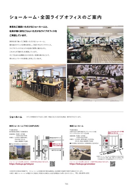 ショールーム・全国ライブオフィスのご案内家具をご確認いただけるショールームと、社員が働く姿をごらんいただけるライブオフィスをご用意しています。家具を見て触ってご確認いただけるショールーム。最先端のオフィス空間を研究し、ご紹介するライブオフィス。ライブオフィスではコクヨ社員が実際に働きながら、これからの「働き方」を実践しています。そこで生まれる課題と日々向き合い改善を続けることで、得られたノウハウを皆様に共有していきます。品川ライブオフィス(THECAMPUS内)梅田ライブオフィスオープンコミュニケーションホール「core」THECAMPUS内)大阪梅田駅ナレッジキャピタルタワーC11階梅田ショールーム〒530-0011大阪市北区大深町3番1号グランフロント大阪ナレッジキャピタルタワーC11階営業時間/9:00〜17:00※見学は完全予約制休館日/土日祝日、夏季休業日、年末年始、5月1日、改装工事期間(不定期)●JR大阪駅より徒歩約5分、大阪梅田駅より徒歩約5分東京品川SSTオフィス東京ショールーム(THECAMPUS内)〒108-8710東京都港区港南1丁目8番35号営業時間/9:00〜17:00※見学は完全予約制休館日/土日祝日、夏期休業日、年末年始、5月1日、改装工事期間(不定期)●JR品川駅港南口より徒歩約3分東京ショールーム(THECAMPUS内)梅田ショールームショールームオフィス用家具だけではなく、目的・用途に応じたさまざまな商品・展示をそろえています。駅阪大RJ※梅田ショールームは、法人のお客様向けの完全予約制となっております。新築・改装・移転、または家具のご購入を計画されているお客様対象のショールームです。ショールームへのお問い合わせ・ご見学予約はWebで承ります。https://kokuyo.jp/tokyosrショールームへのお問い合わせ・ご見学予約はWebで承ります。https://kokuyo.jp/umedasr※2024年12月時点の情報です。※ショールームの営業日時や展示品構成は、社会情勢や改装等で変更する場合がございます。※東京・梅田ショールームへお電話でのご相談をご希望される場合は、右記代表電話までお問い合わせください。TEL(06)6976-1221164