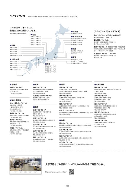 ライブオフィス実際にコクヨ社員が働く現場を見ながら、ソリューションを実感していただけます。コクヨのライブオフィスは、全国29カ所に展開しています。※2024年12月時点の情報です。■関西京都ライブオフィス梅田ライブオフィス神戸ライブオフィス姫路ライブオフィス和歌山ライブオフィス■九州・沖縄福岡ライブオフィス長崎ライブオフィス宮崎ライブオフィス鹿児島ライブオフィス沖縄ライブオフィス■北海道札幌ライブオフィス北海道札幌市白石区東札幌5条5丁目1番7号TEL:011-815-5940■東北・北関東仙台一番町ライブオフィス宮城県仙台市青葉区一番町1丁目1番41号カメイ仙台中央ビルTEL:022-217-6594宇都宮ライブオフィス栃木県宇都宮市問屋町3172番48TEL:028-680-7807水戸ライブオフィス茨城県水戸市千波町1968番3号水戸東石ビル1階TEL:029-291-5593前橋ライブオフィス群馬県前橋市南町2丁目43番2号SK21ビルA4階TEL:027-220-5123■北陸新潟ライブオフィス長岡ライブオフィス富山ライブオフィス金沢ライブオフィス福井ライブオフィス■中国岡山ライブオフィス松江ライブオフィス広島ライブオフィス山口ライブオフィス■北海道札幌ライブオフィス■東北・北関東仙台一番町ライブオフィス宇都宮ライブオフィス水戸ライブオフィス前橋ライブオフィス■関東霞が関ライブオフィス品川ライブオフィス■東海静岡ライブオフィス名古屋ライブオフィス名古屋上前津ライブオフィス【フラッグシップライブオフィス】品川ライブオフィス(THECAMPUS内)東京都港区港南1丁目8番35号霞が関ライブオフィス東京都千代田区霞が関3丁目2番5号霞が関ビルディング18階梅田ライブオフィスWORKSTYLETHEATER大阪府大阪市北区大深町3番1号グランフロント大阪ナレッジキャピタルタワーC12階名古屋ライブオフィスWITHW愛知県名古屋市中区栄4丁目1番1号中日ビル17階■東海静岡ライブオフィス静岡県静岡市葵区黒金町59番7号ニッセイ静岡駅前ビル7階TEL:054-685-8160名古屋上前津ライブオフィス愛知県名古屋市中区上前津1丁目4番10号加藤憲ビル■北陸新潟ライブオフィス新潟県新潟市中央区神道寺南2丁目4番21号TEL:025-240-1594長岡ライブオフィス新潟県長岡市川崎6丁目848番地1号TEL:0258-89-6594富山ライブオフィス富山県富山市黒瀬北町2丁目17番2号TEL:076-491-5941金沢ライブオフィス石川県金沢市鞍月4丁目187番地TEL:076-266-0594福井ライブオフィス福井県福井市問屋町1丁目33番地TEL:0776-30-0594■関西京都ライブオフィス京都府京都市下京区綾小路通烏丸西入童侍者町167番AYA四条烏丸ビル8階TEL:075-353-0301神戸ライブオフィス兵庫県神戸市中央区加納町4丁目4番17号ニッセイ三宮ビル12階TEL:078-334-6081姫路ライブオフィス兵庫県姫路市駅前町60番地マルイト姫路ビル1階TEL:050-3183-0381和歌山ライブオフィス和歌山県和歌山市美園町2丁目1番地太陽生命和歌山第2ビル2階TEL:073-406-7671■中国岡山ライブオフィス岡山県岡山市北区磨屋町3番10号岡山ニューシティビル6階TEL:086-223-5942広島ライブオフィス広島県広島市中区大手町1丁目2番1号おりづるタワー7階TEL:082-546-0594松江ライブオフィス島根県松江市白潟本町13番4号大樹生命松江ビル1階TEL:0852-60-1721山口ライブオフィス山口県山口市小郡高砂町2丁目7番地朝日生命小郡ビル9階TEL:083-600-0594■九州・沖縄福岡ライブオフィス福岡県福岡市博多区博多駅前2丁目20番1号大博多ビル3階TEL:092-437-5940長崎ライブオフィス長崎県長崎市西坂町2番3号長崎駅前第一生命ビル2階TEL:095-829-6211宮崎ライブオフィス宮崎県宮崎市高千穂通2丁目1番33号明治安田生命宮崎ビル7階TEL:0985-83-3478鹿児島ライブオフィス鹿児島県鹿児島市西田1丁目5番1号鹿児島高見橋ビル8階TEL:099-213-0594沖縄ライブオフィス沖縄県那覇市久茂地2丁目2番2号タイムスビル7階TEL:098-860-0594見学予約などの詳細については、Webサイトをご確認ください。https://kokuyo.jp/liveoffice/165