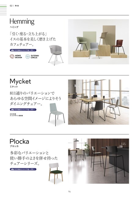 02待合ヘミング「引く・座る・立ち上がる」イスの基本を美しく磨き上げたカフェチェアー。ß2025版総合カタログF編P.202〜ミケット811通りのバリエーションであらゆる空間イメージによりそうダイニングチェアー。ß2025版総合カタログF編P.205〜2019年度グッドデザイン賞受賞プロッカ多彩なバリエーションと使い勝手のよさを併せ持ったチェアーシリーズ。ß2025版総合カタログF編P.208〜96