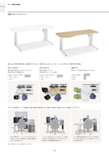 03診察室・処置室診察デスク〈インフォントi〉限られた時間で質の高い診療を行うために、患者さんとのコミュニケーションを考えた天板形状を用意。ストレートタイプ聴診・視診・触診等が、より行いやすいように、医師と患者さんの距離が近い。ラウンドタイプ問診や説明のしやすさ、資料を置けるスペースにも配慮。L型タイプ患者さんとの対面式で会話しやすい形状。W1400W1600D600W1800D700H720W1400W1600D750W1800D850H720W1600W1800D1600H720デスクと収納をセットで使用する際、医師が無理のない姿勢で効率よく動けるように配慮したデザイン。サイド収納のトレー・オープンコンビをセットでお使いいただくと、無理のない姿勢で書類の出し入れが可能です。※デスク周辺オプションはP.104をごらんください。ハンギング用オプションや卓上トレー収納(別売)にも手が届きやすいデスクサイズで、無駄のない業務動線を実現します。トレー収納(A4縦12段)やプリンター(別売)をセットでご使用いただいても作業スペースを広く確保できます。102